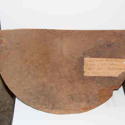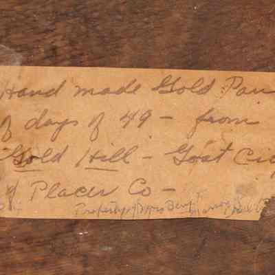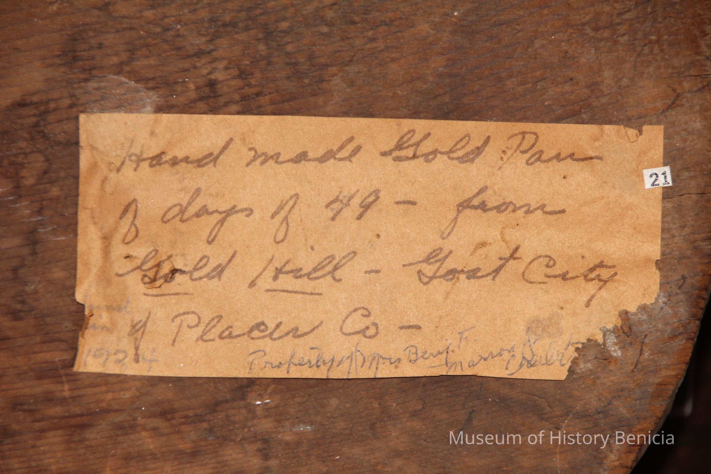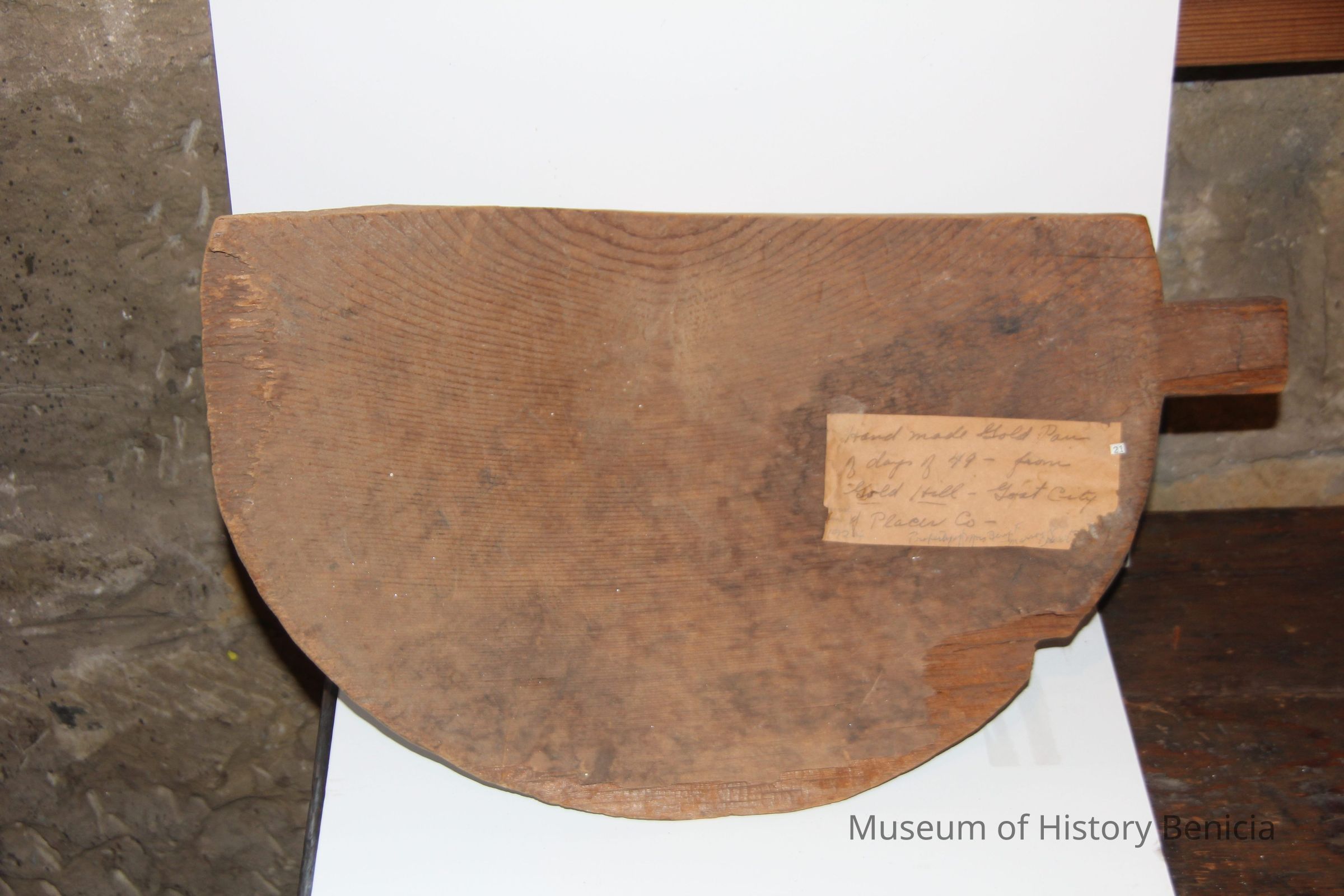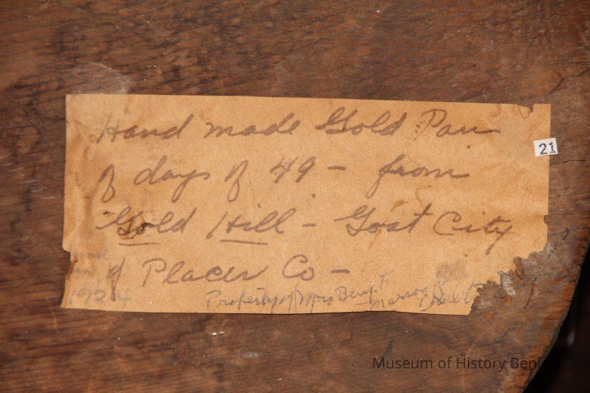 handmade wooden gold pan. There's a tag on it that says "Hand Made Gold Pan of days of '49 from Gold Hill Goat City of Placer Co. 1904 property of Mrs Benj. F Masson.Collection
