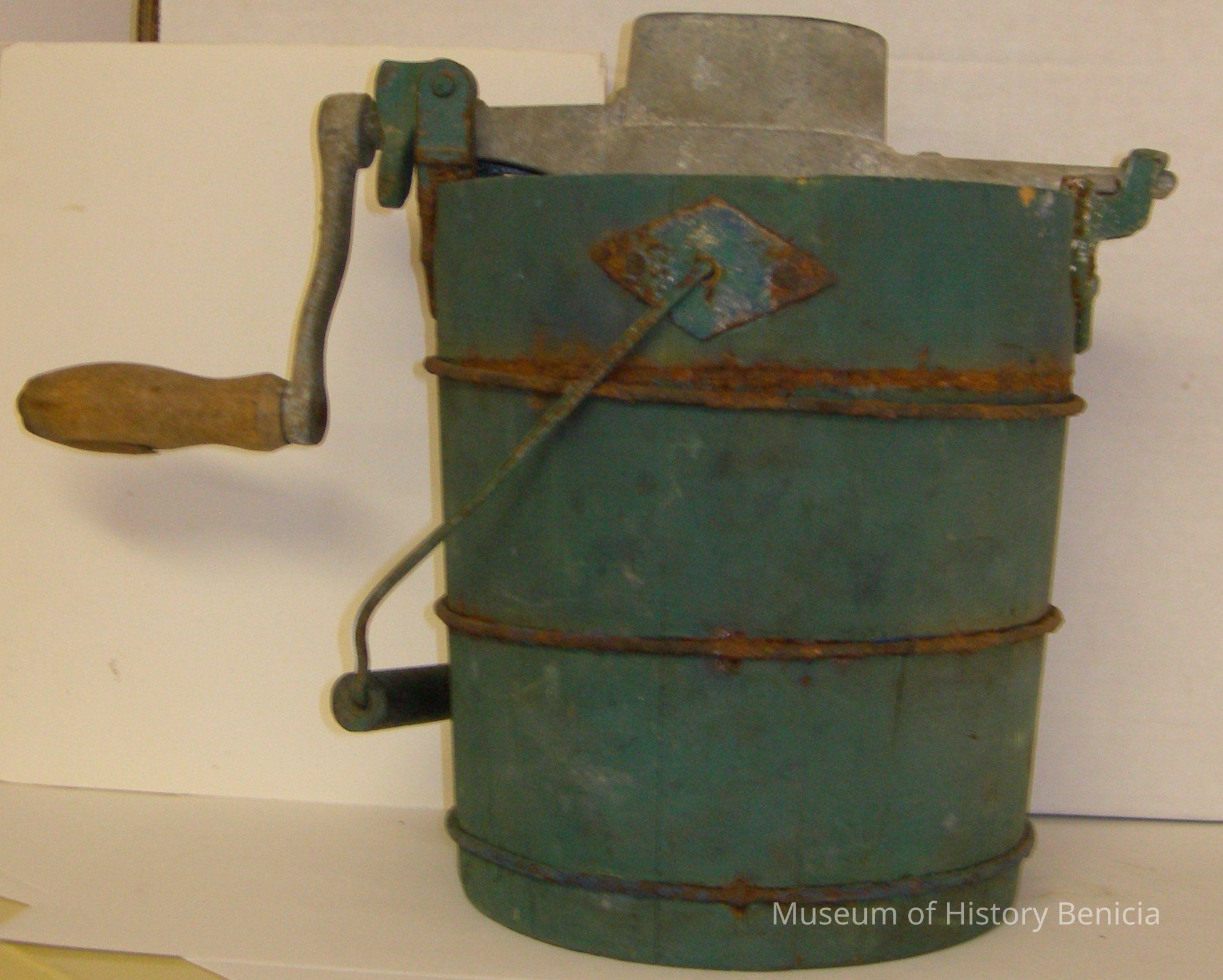 Jersey ice cream maker - hand operated; gren wood barrel-style, three metal wire as outside support; cast aluminum (heavy) ingredients holder, paddle mixer inside tube (4" diameter x 5.5 deep); handle folds over to hold tube in place, crank is on end - wood handle for turning; "Jersey Qt" on top (small number is indecipherable); #369 is inside the lide of the tube; also a wire carrying handle with wood holder in middle.Collection