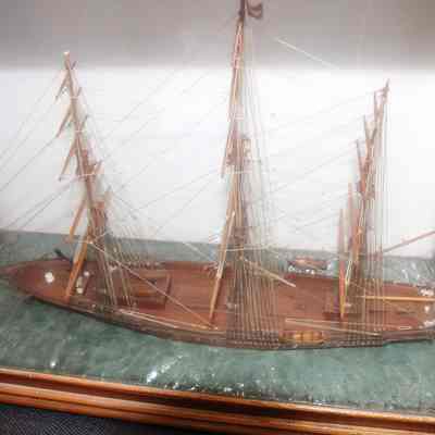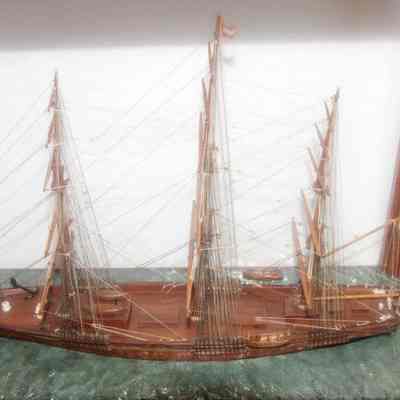 Ship model of the Clipper Ship "Staffordshire". Model was built by Lawrence Fish grandson of Eunice Riddell who came to California on this ship in 1852. She traveled from Boston to SF with her 4 children and the family possessions. The ship was built from Mahogany and Walnut taken from pieces of furniture brought around the Horn by Mrs Riddell in 1852.Collection