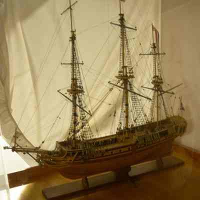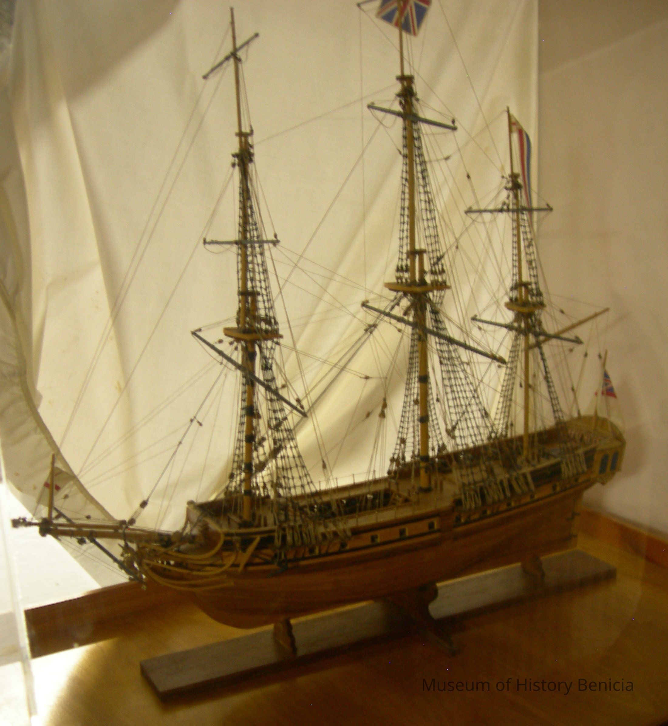 Ship model of the HMS Unicorn with vitrene cover and wooden base. Made by Mr. Robert Evans (deceased) a Benicia resident. Produced as a hobby model and given to Mr & Mrs DeRome as a gift. Vitrene dimension 3 feet wide, 2 feet deep, and 34 inches high. Ship hull approximately 2 feet long and 30 inches tall.Collection