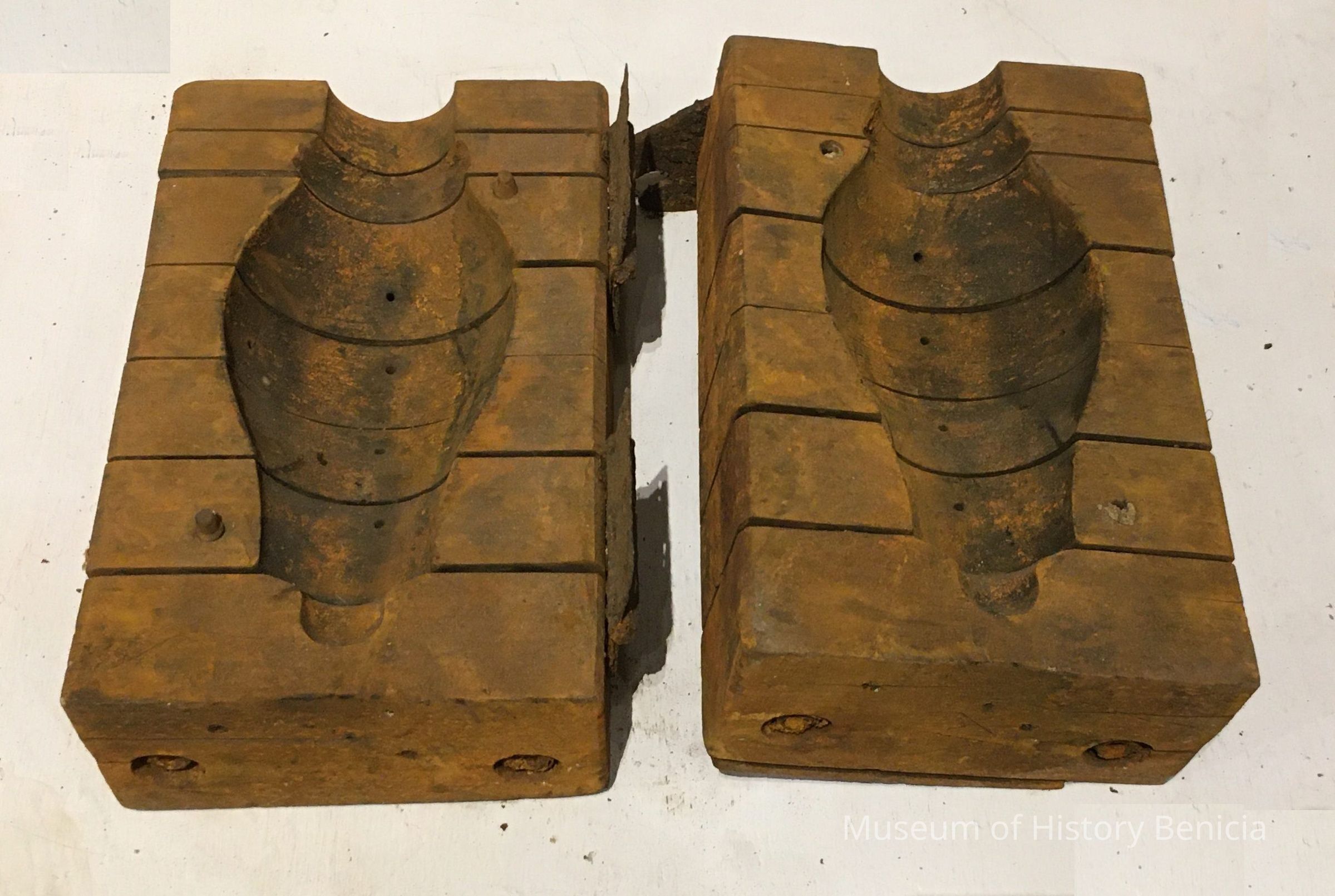 Two-piece wooden casting mold for a small glass lantern. Mold is 11" x 7" x 3 1/2". Used at Yuba Manufacturing plant in Benicia.