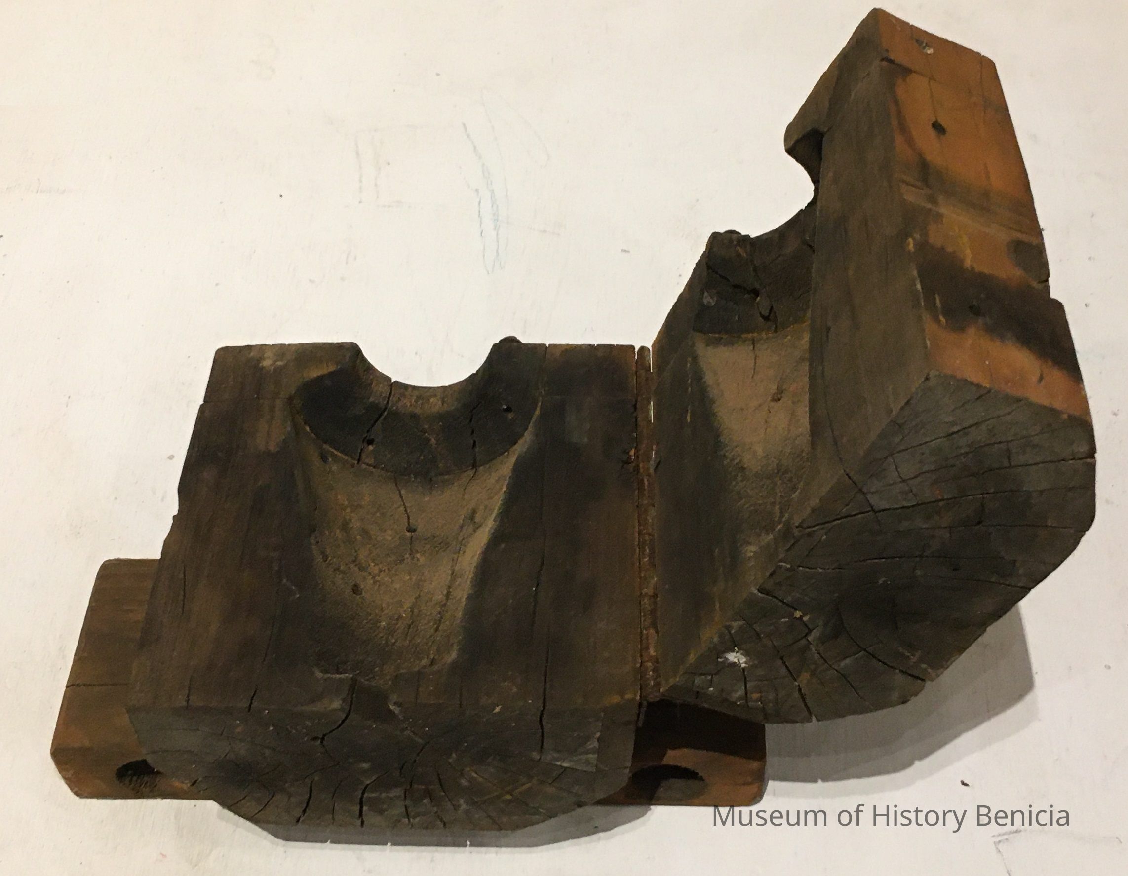 Hinged wooden casting mold for a small glass lamp. Mold is 6" x 6" x 6 1/2". Used at Yuba Manufacturing plant in Benicia.