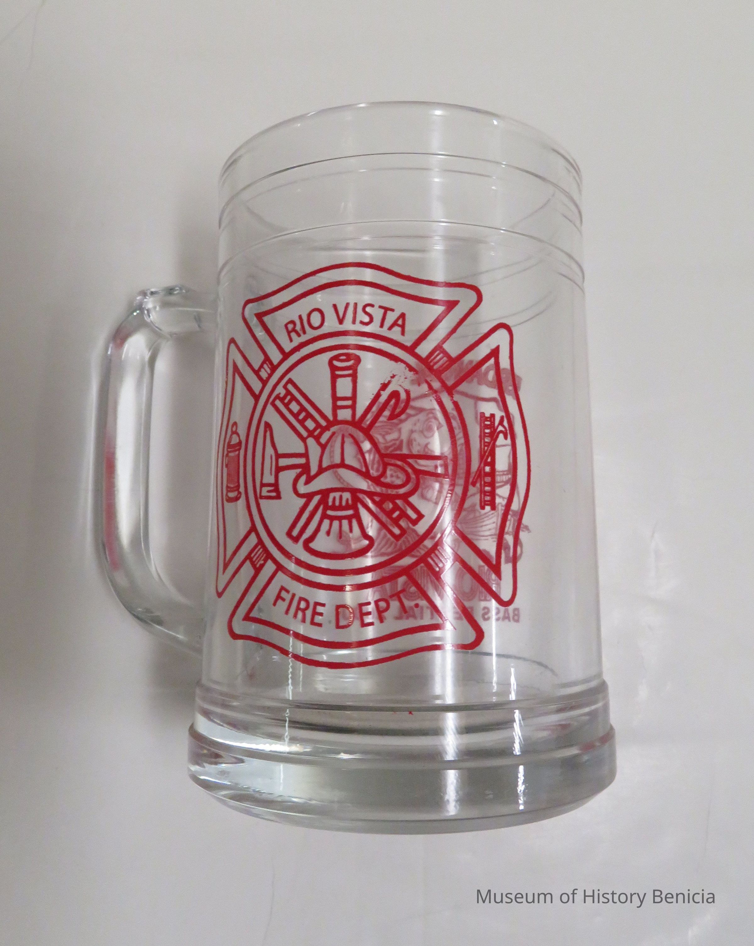 Glass mug with red lettering "Rio Vista Fire Dept." On opposite side is a picture of a bass with the wording 53rd Annual Rio Vista Bass Festival 2000.