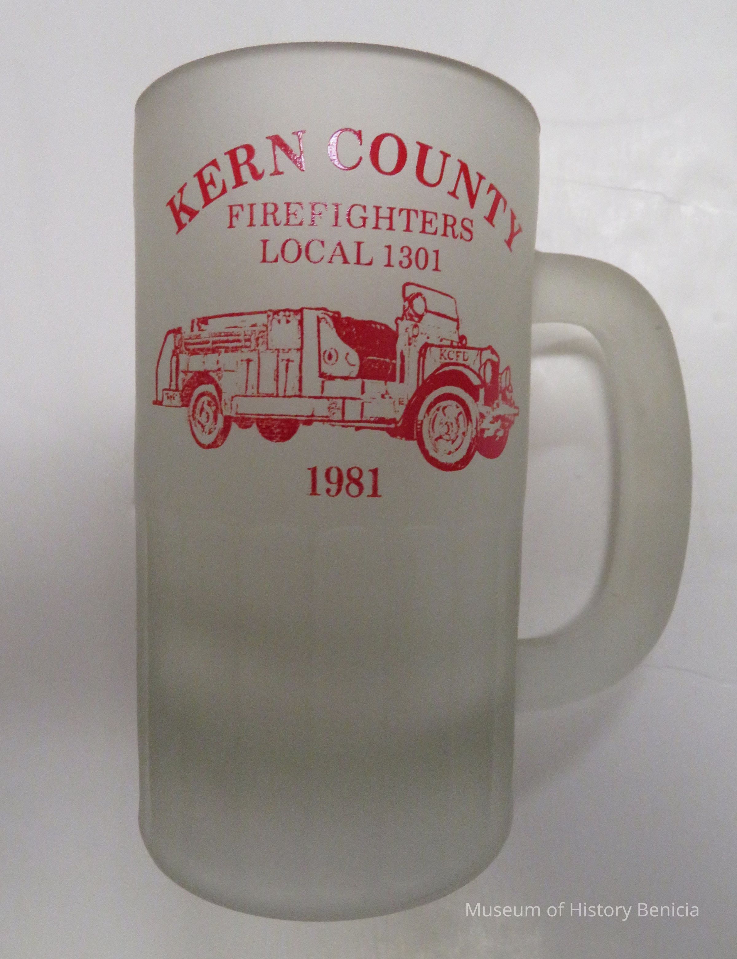 Glass mug with red lettering "Kern County Firefighters Local 1301, 1981" and a picture of a firetruck.