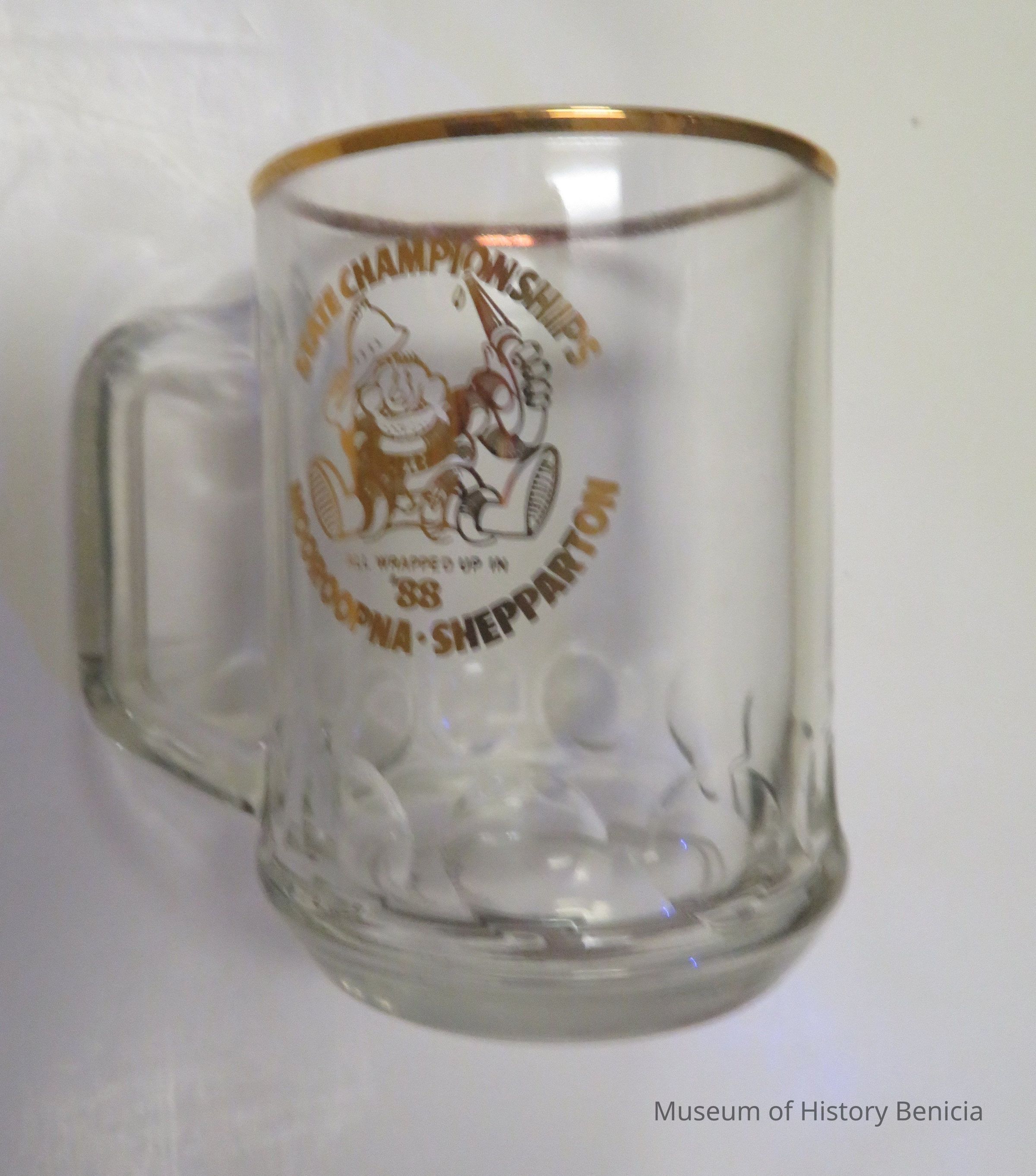 Clear glass mug with gold rim along top and gold lettering that reads "State Championships Mooroopna - Shepparton." In midde is a cartoon fireman and the wording "All wrapped up in '88."Collection