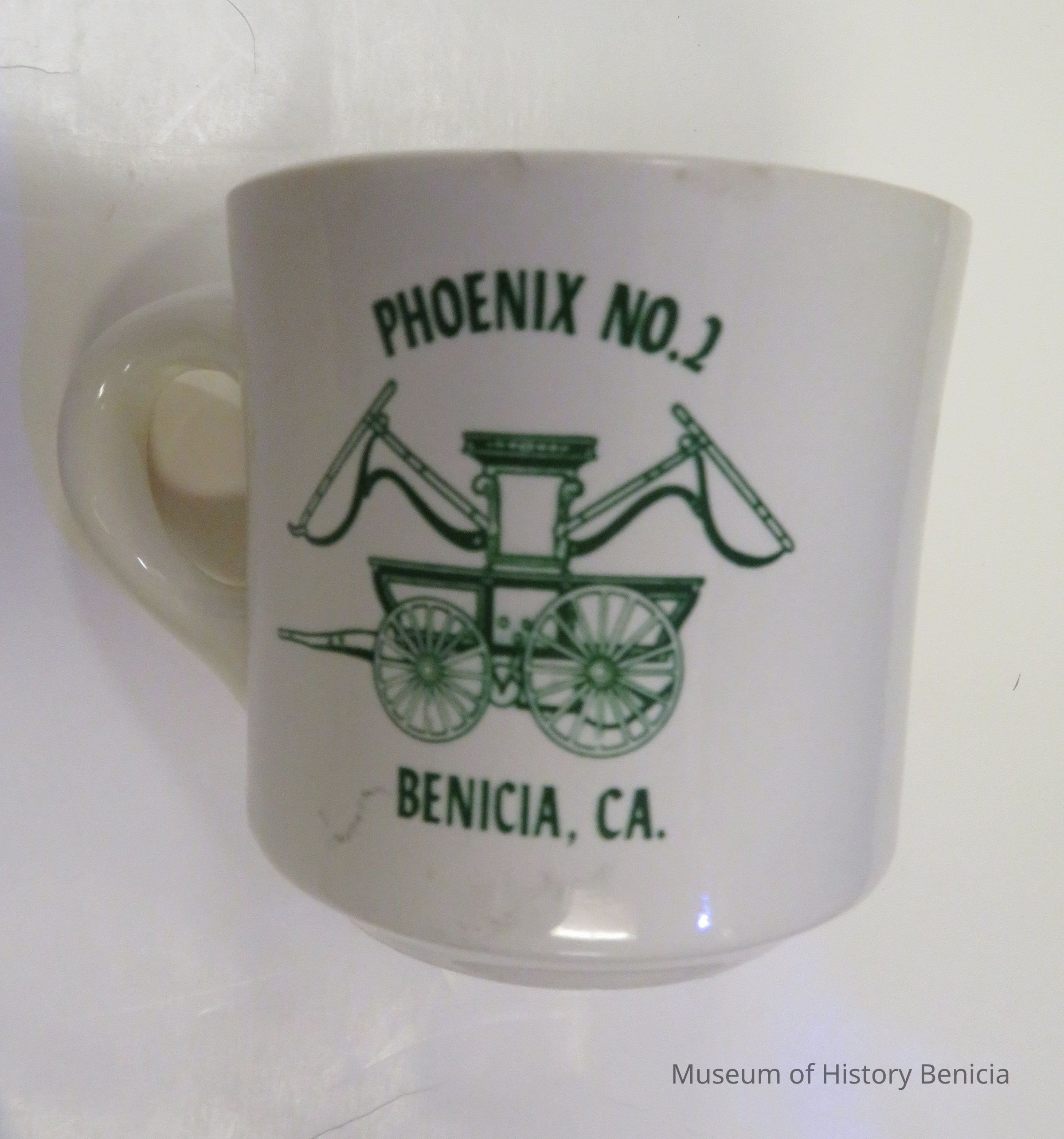 Ceramic mug with green lettering which reads "Phoenic No. 1, Benicia, Ca." In center of wording is a picture of the fire pumper.