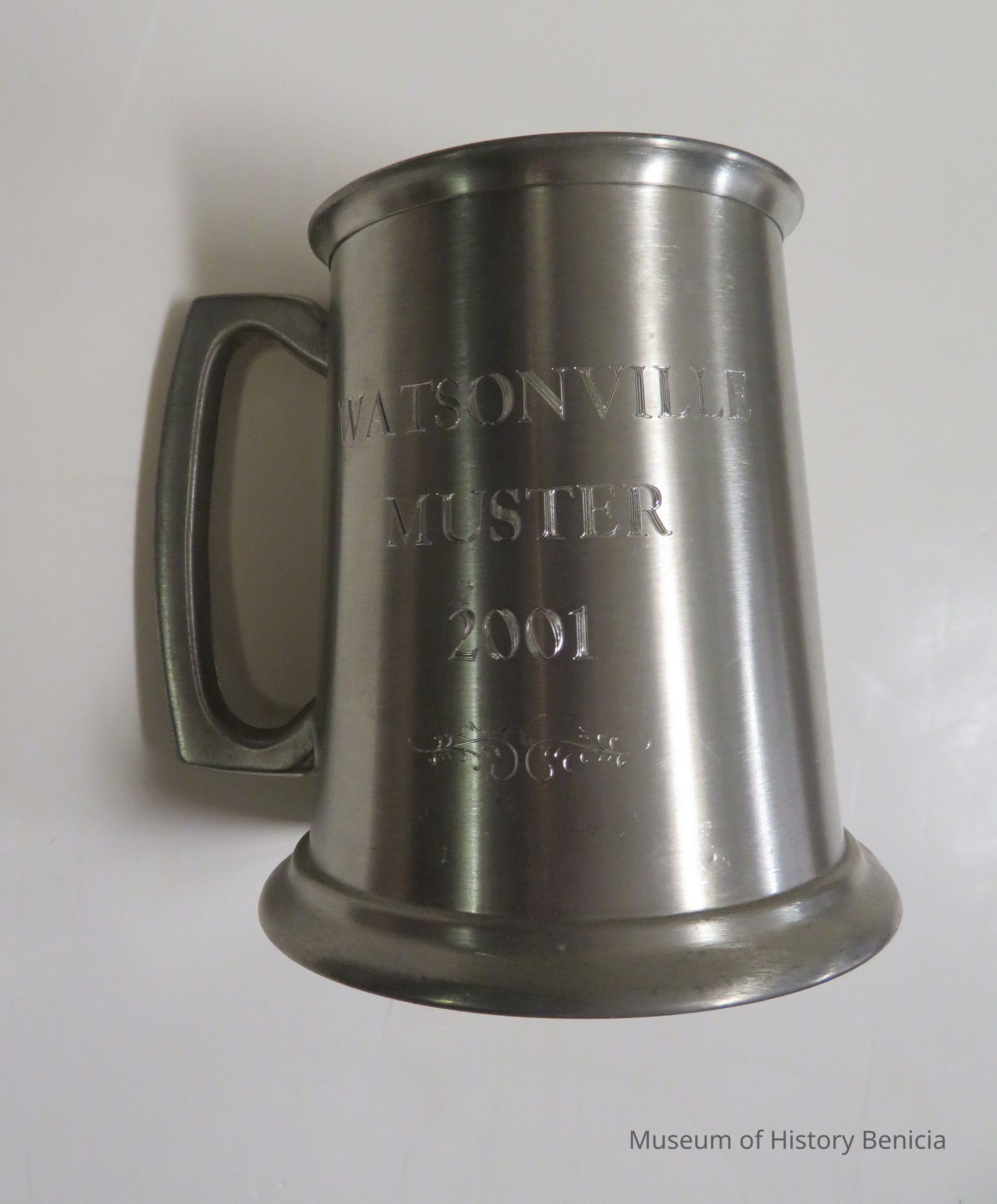 Pewter cup engraved with Watsonville Muster 2001. On bottom of cup is inscribed "Genuine Fine Pewter. Hand crafted in Sheffield England."