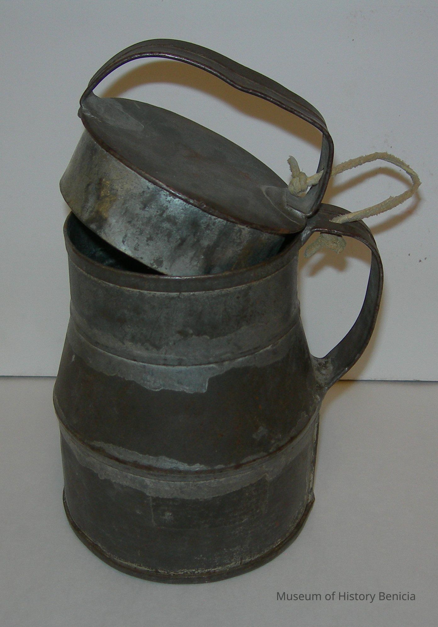 tin mug/cup with lid attached with a rawhide string, handle on lid and on mug