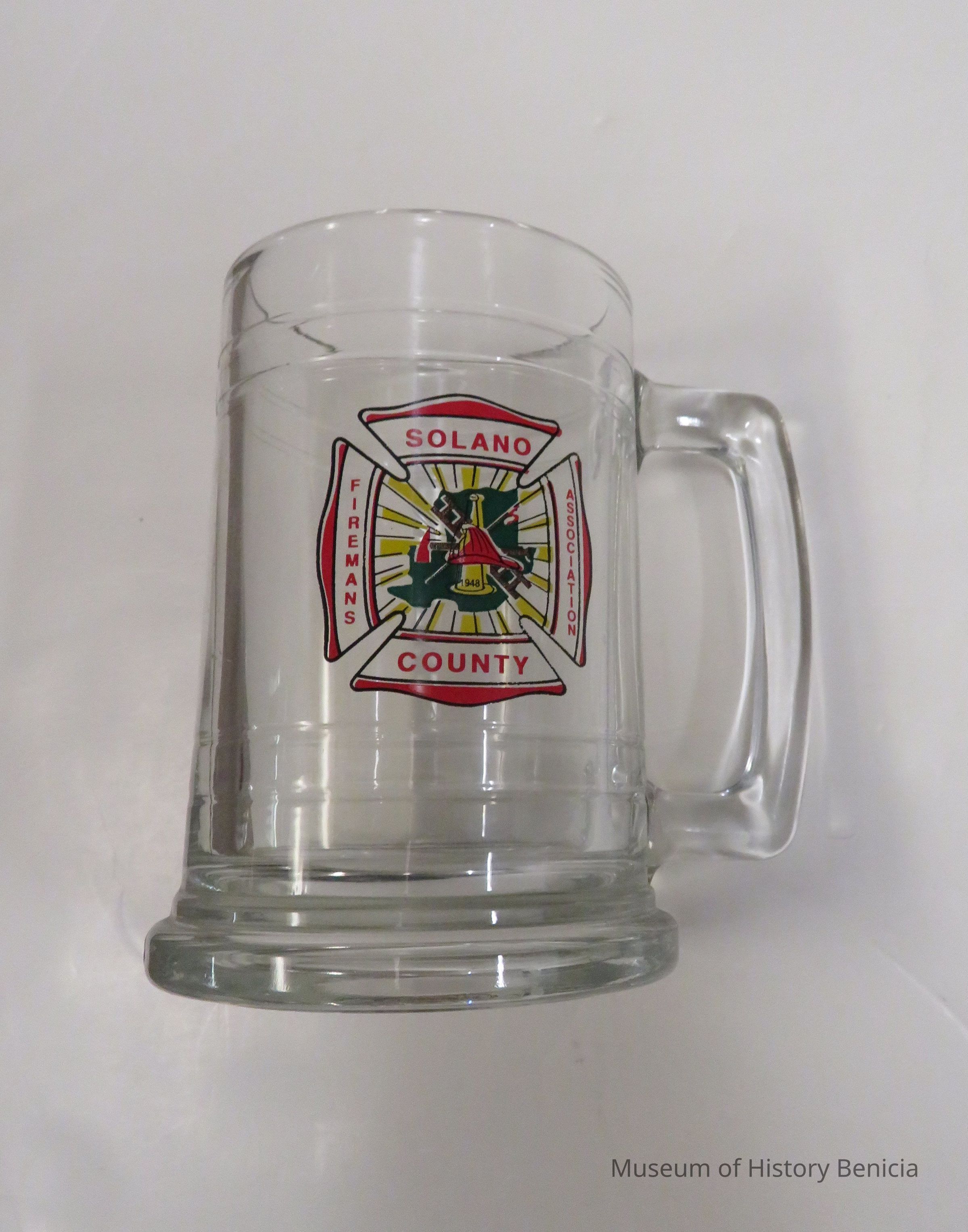 Glass mug with emblem of Solano County Firemans Association.