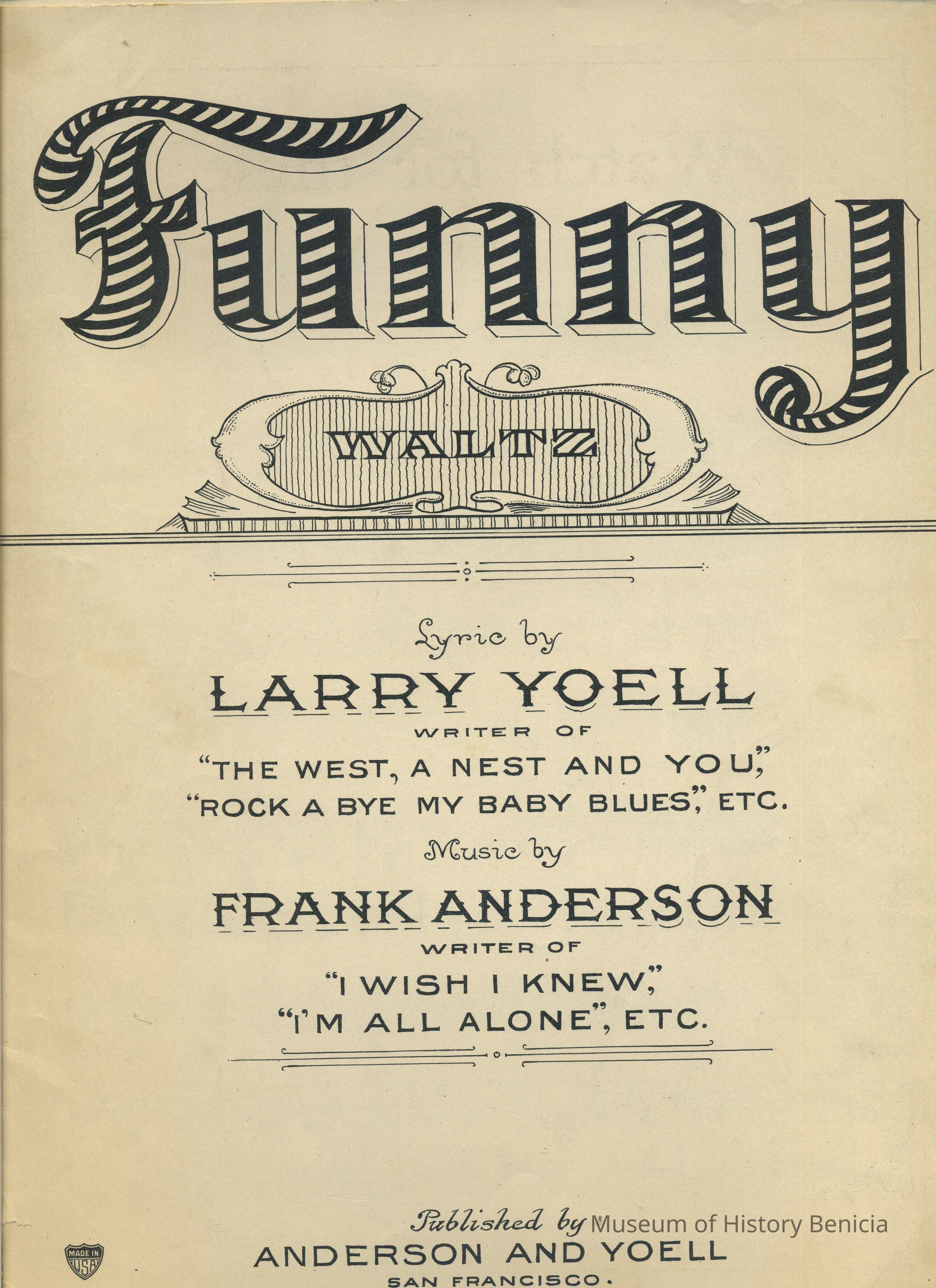 Sheet Music - "Funny" Lyric by Larry Yoell, Music by Frank Anderson Published by Anderson and Yoell - San Francisco, CA 1925 12" x 9"