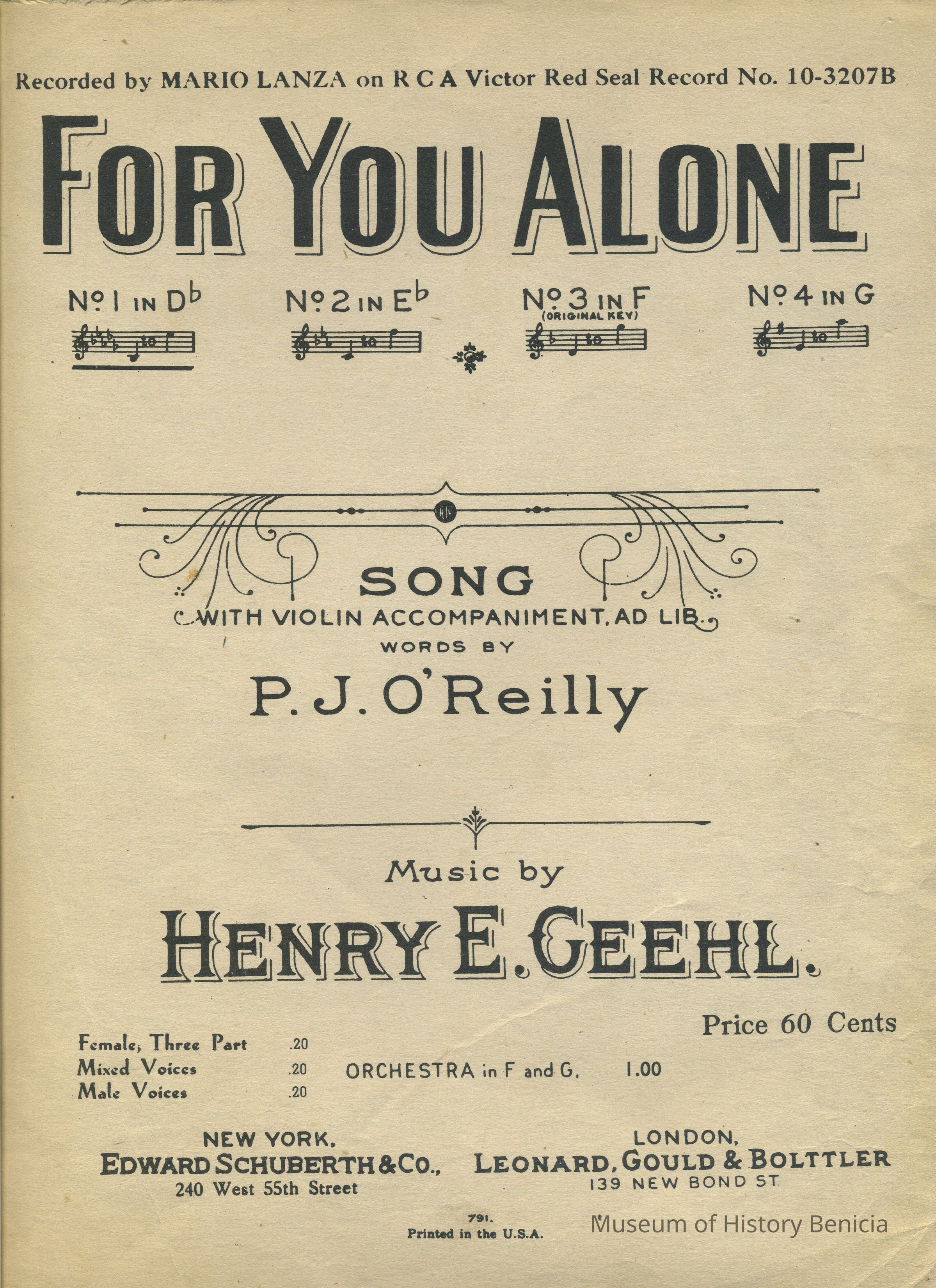 Sheet Music - "For You Alone" - song with violin accompaniment, words by P.J. O'Reilly, music by Henry E. Geehl 1911