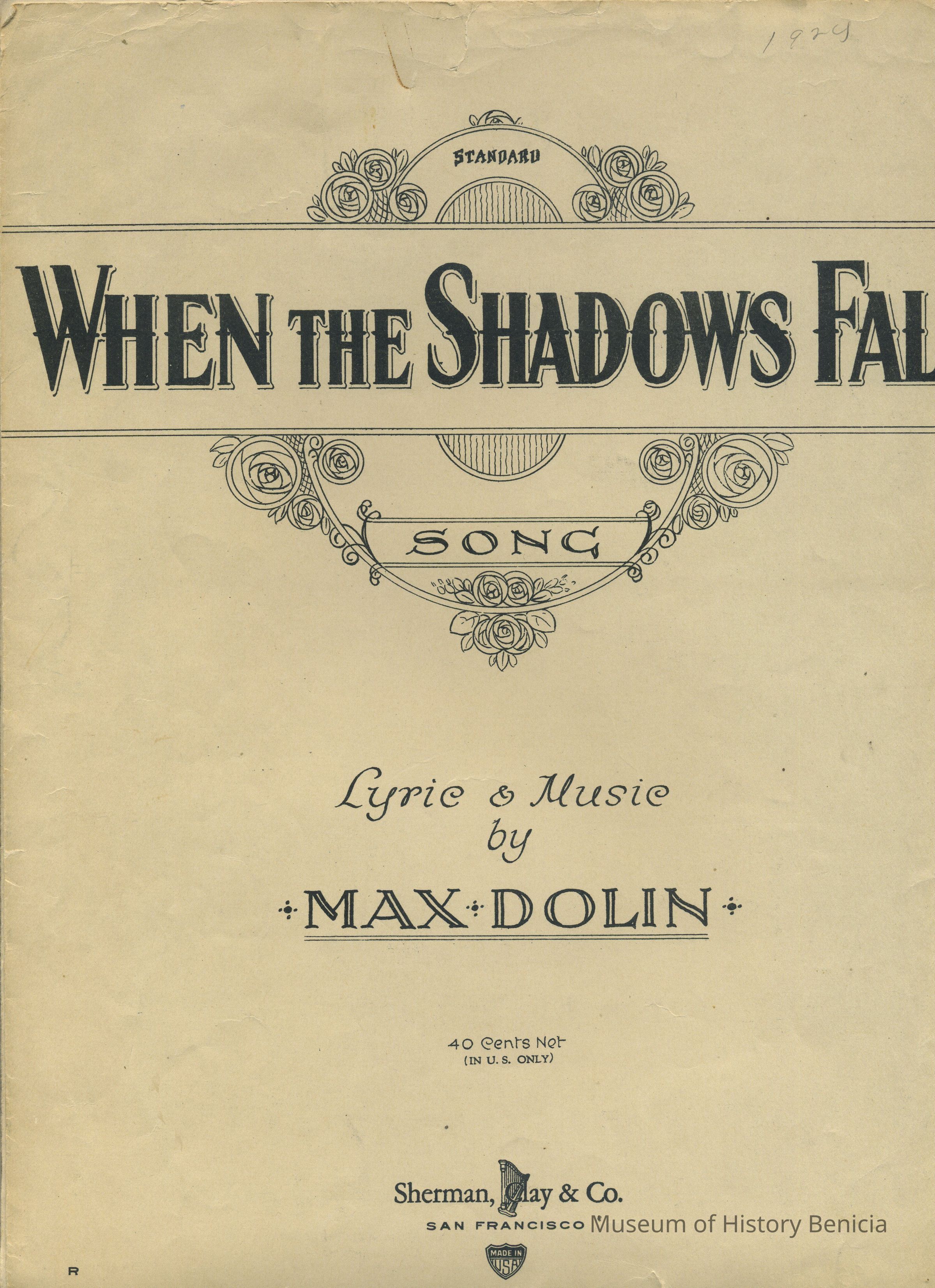 Sheet Music - "When The Shadows Fall" by Max Dolin 1924 Published by Sherman, Clay & Co. - San Francisco, CA 12" x 9"