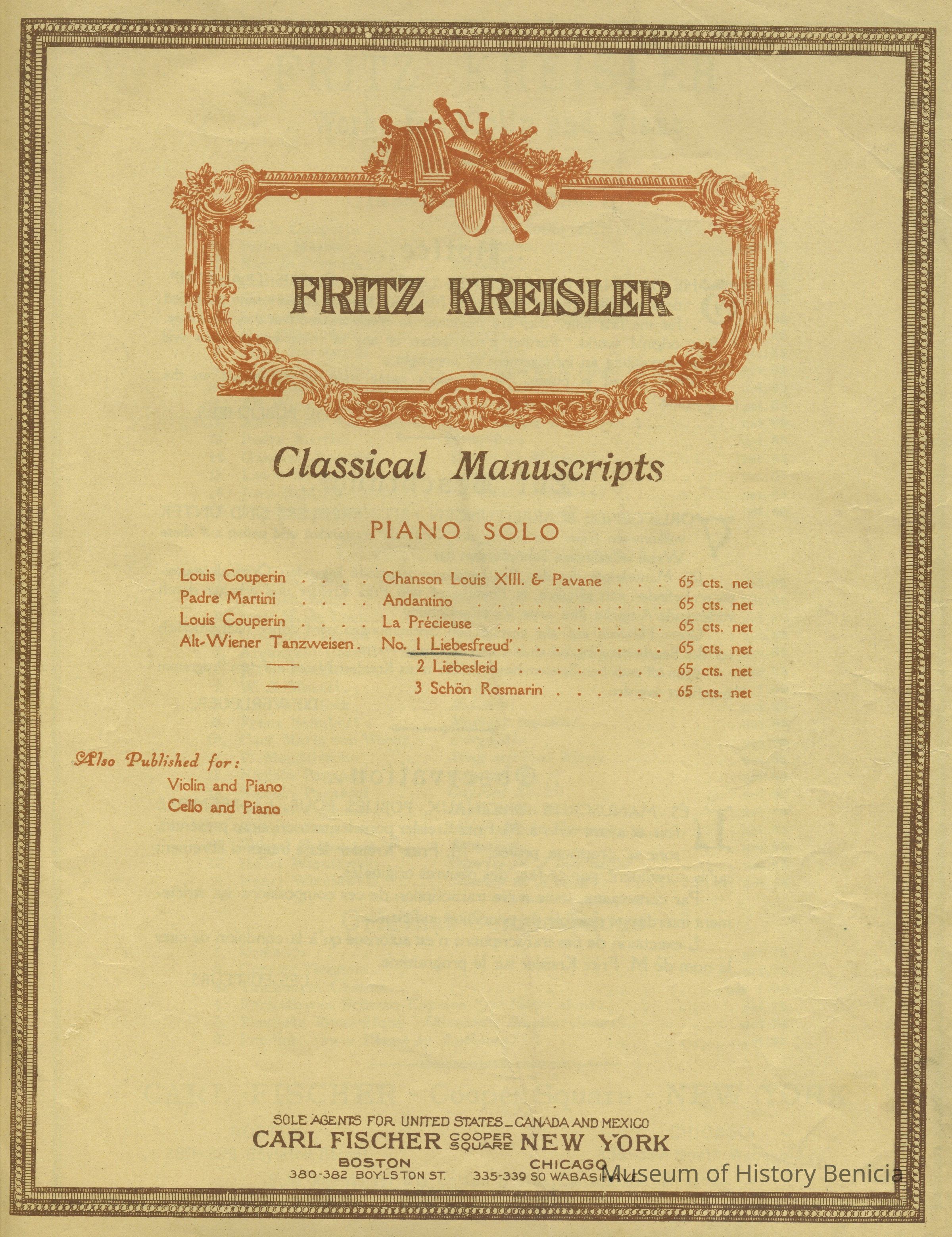 Fritz Kreisler Classical Manuscripts Piano Solos