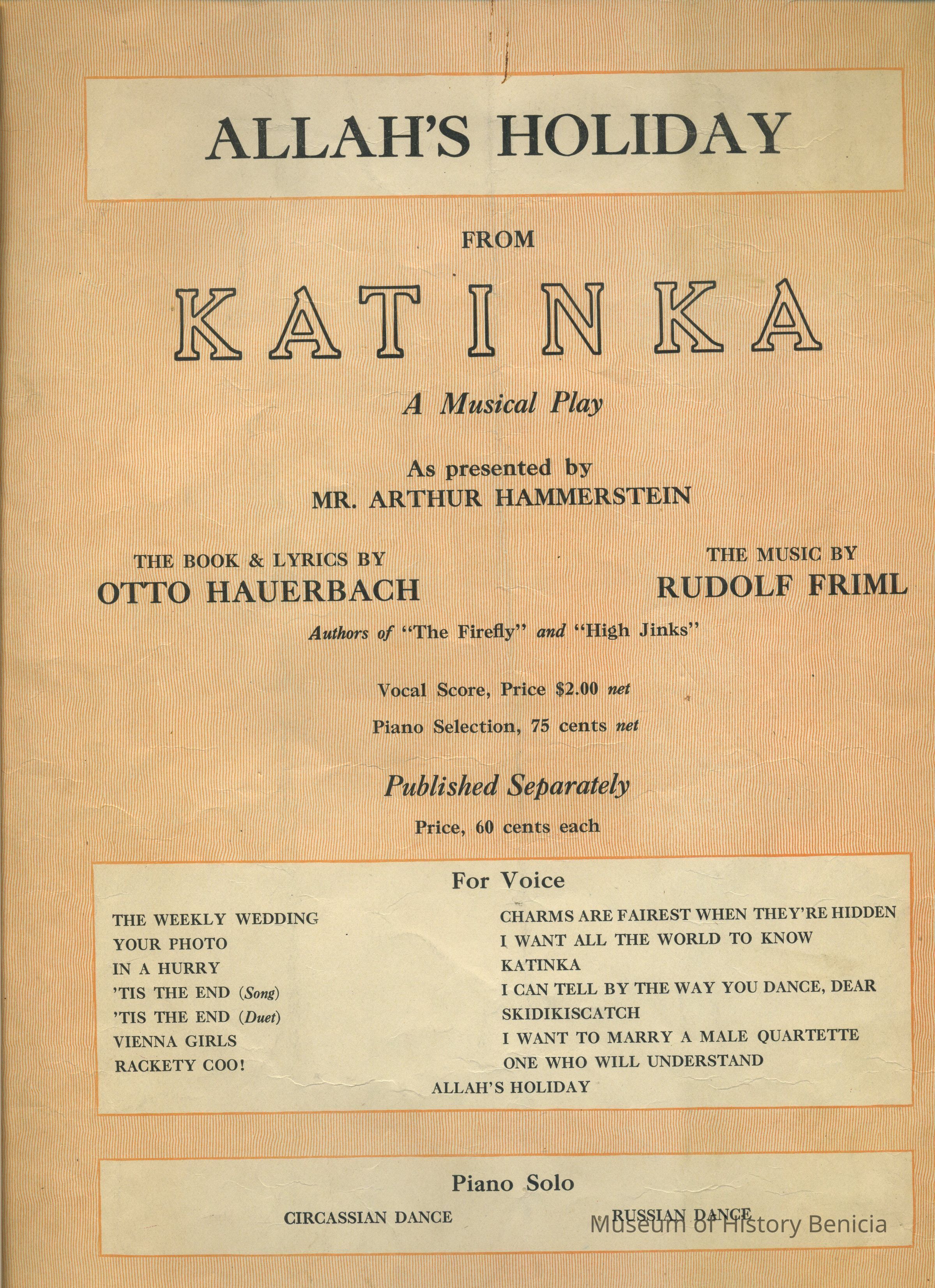 Sheet Music - "Allah's Holiday" from "Katinka", a musical play,