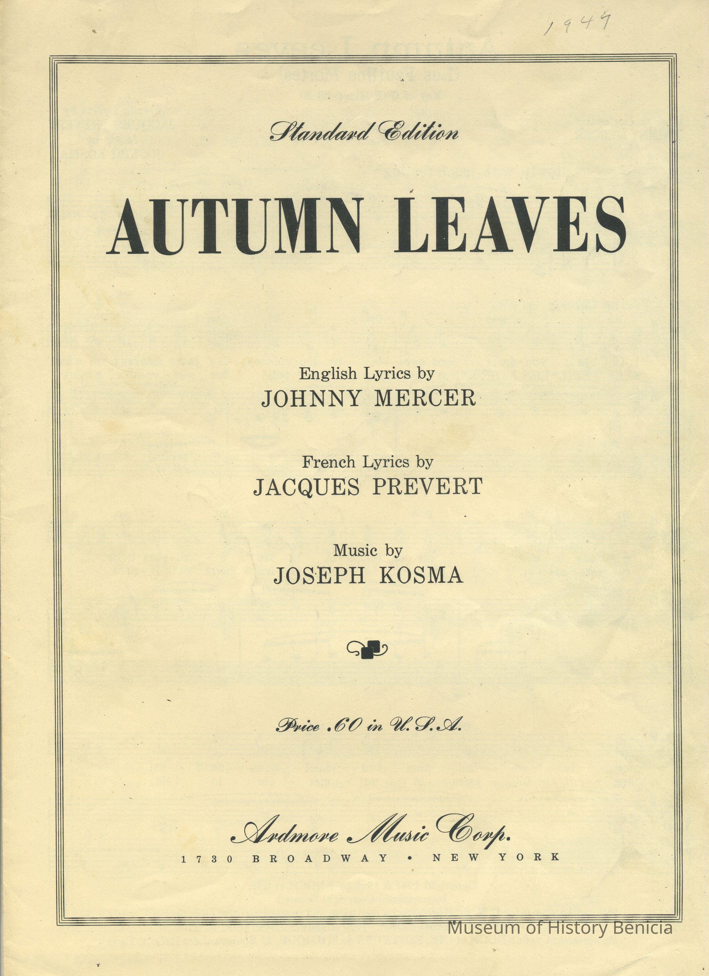 Sheet Music - "Autumn Laves" English Lyrics by Johnny Mercer, French Lyrics by Jacques Prevert, Music by Joseph Kosma 1947