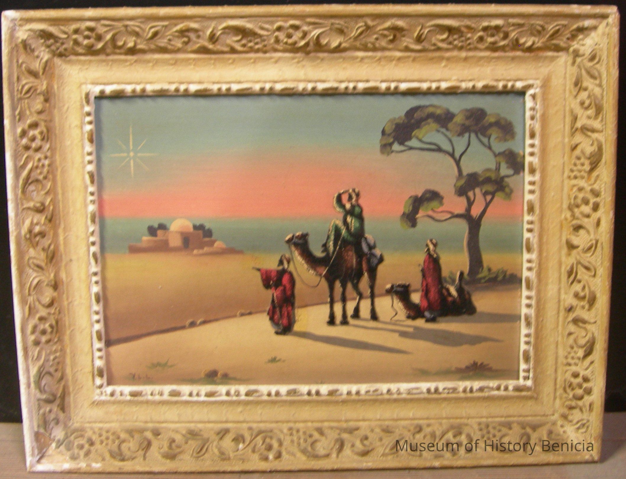 It appears to be a rendering of the Three Wise Men observing a star over the city of Bethlehem; there are also two camels in the scene.