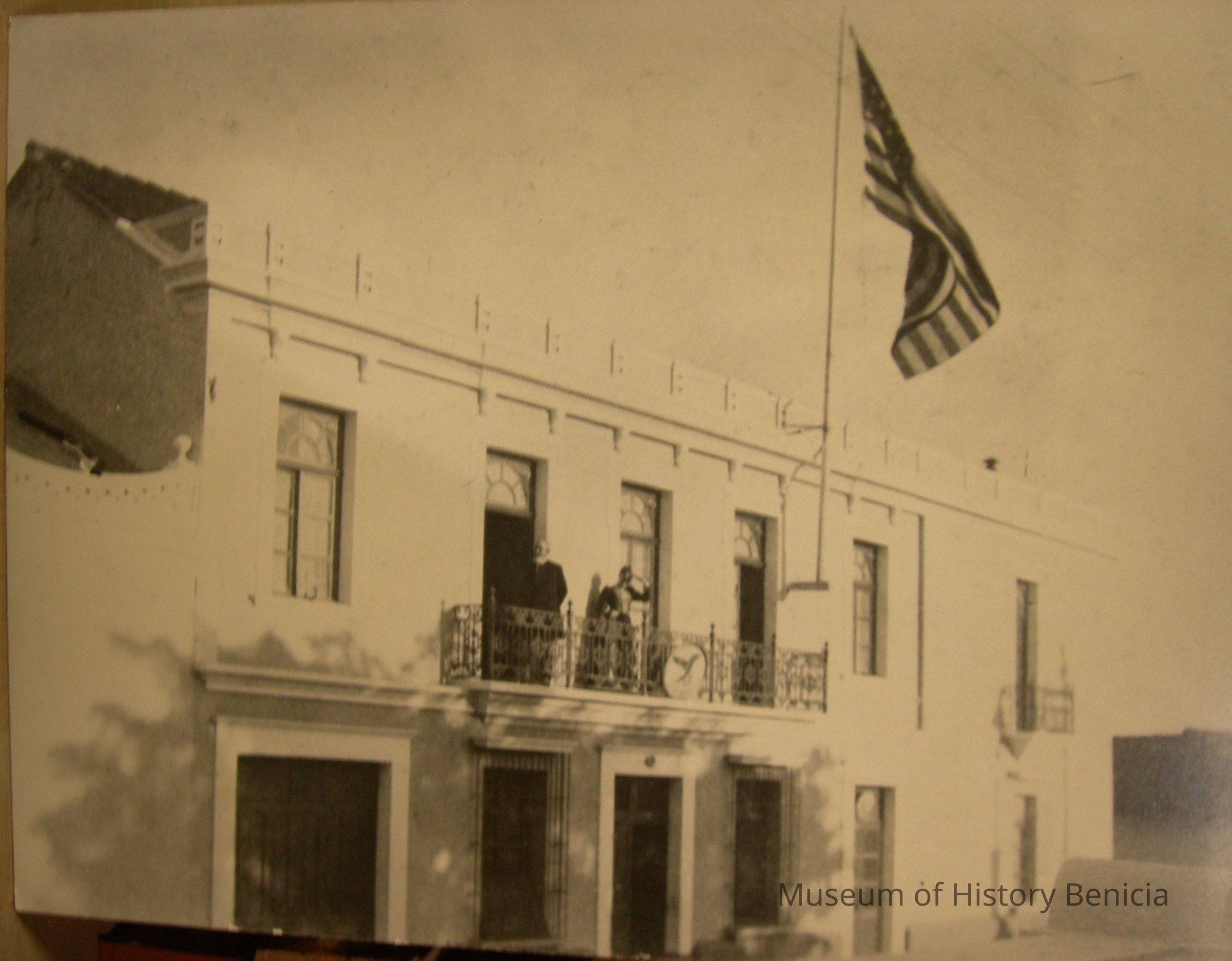 Enlarged B/W photograph of a stone building with two men standing on a balcony. The location is unknown. An older man with a beard is on the left and a younger man in uniform on the right is saluting (perhaps the American Flag farther to the right).