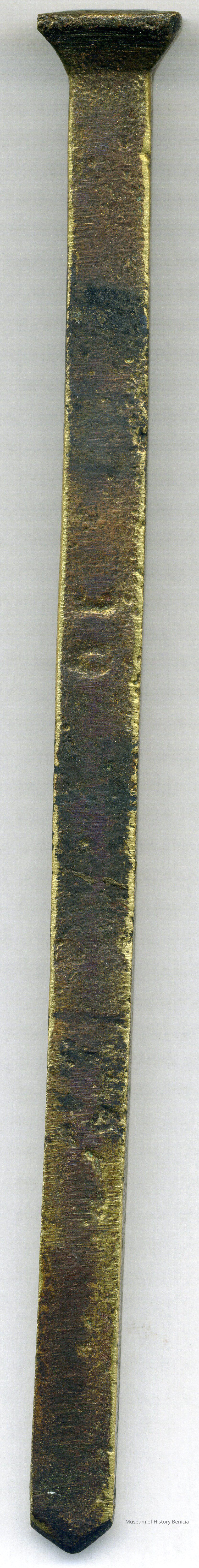This is a brass nail used in shipbuilding. It is a cut nail called a Rosehead flat point nail. It is called Rosehead because of the pyramid shape on top of the nail. This nail is about 7.5 inches (200mm) long, .5 inches (10mm) wide shaft, and .75 inches (20mm) at the head. There is a "10" stamped on the shaft to indicate the size of the shaft.Collection