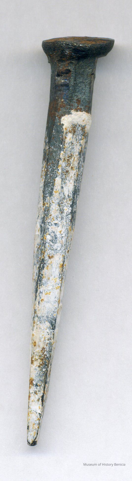 Round-headed nail found on grounds of Clocktower. It is 2 5/8" long with a rectangular shaft, hand-made. It has white paint on shaft.