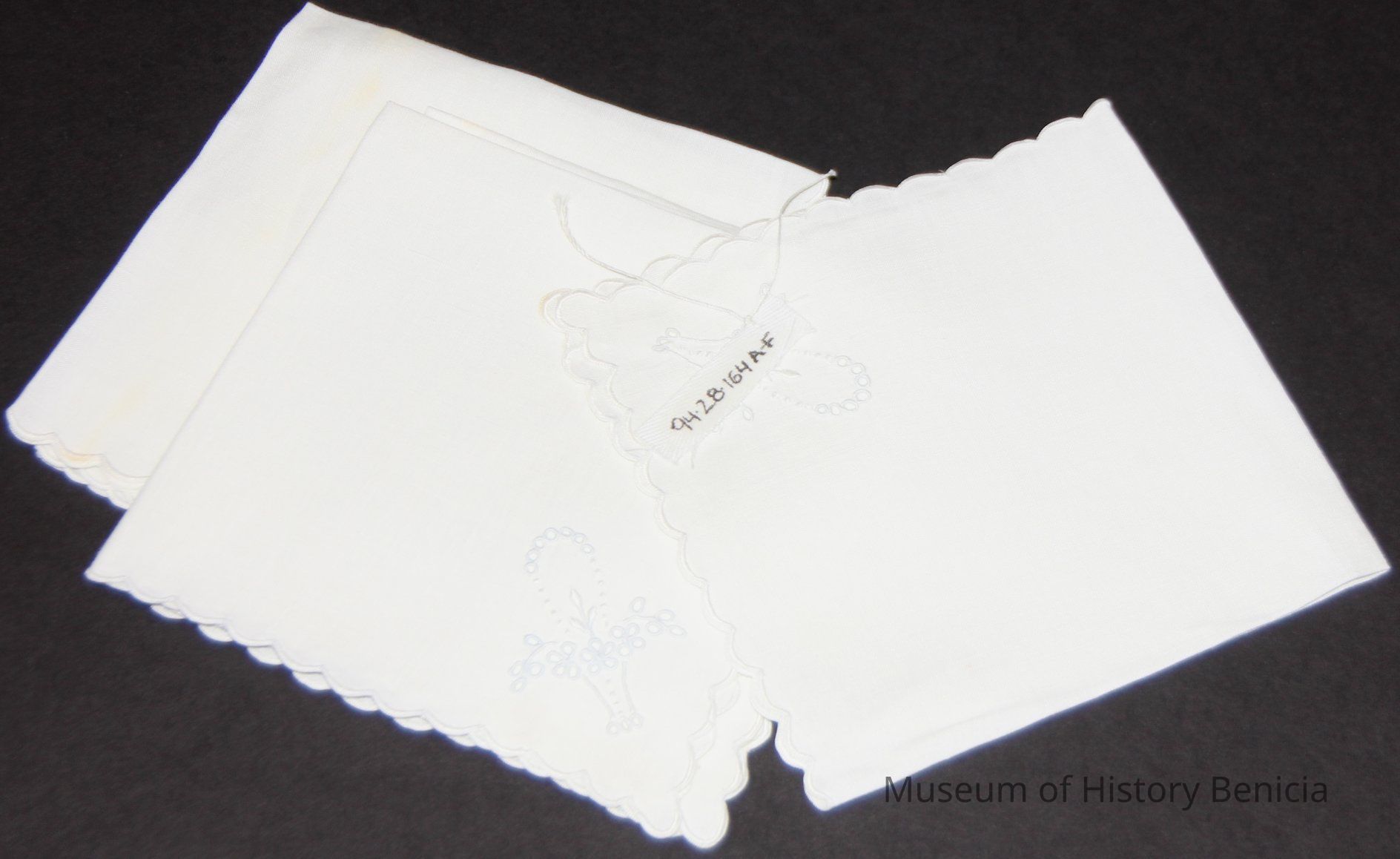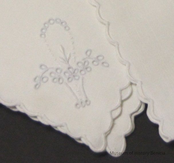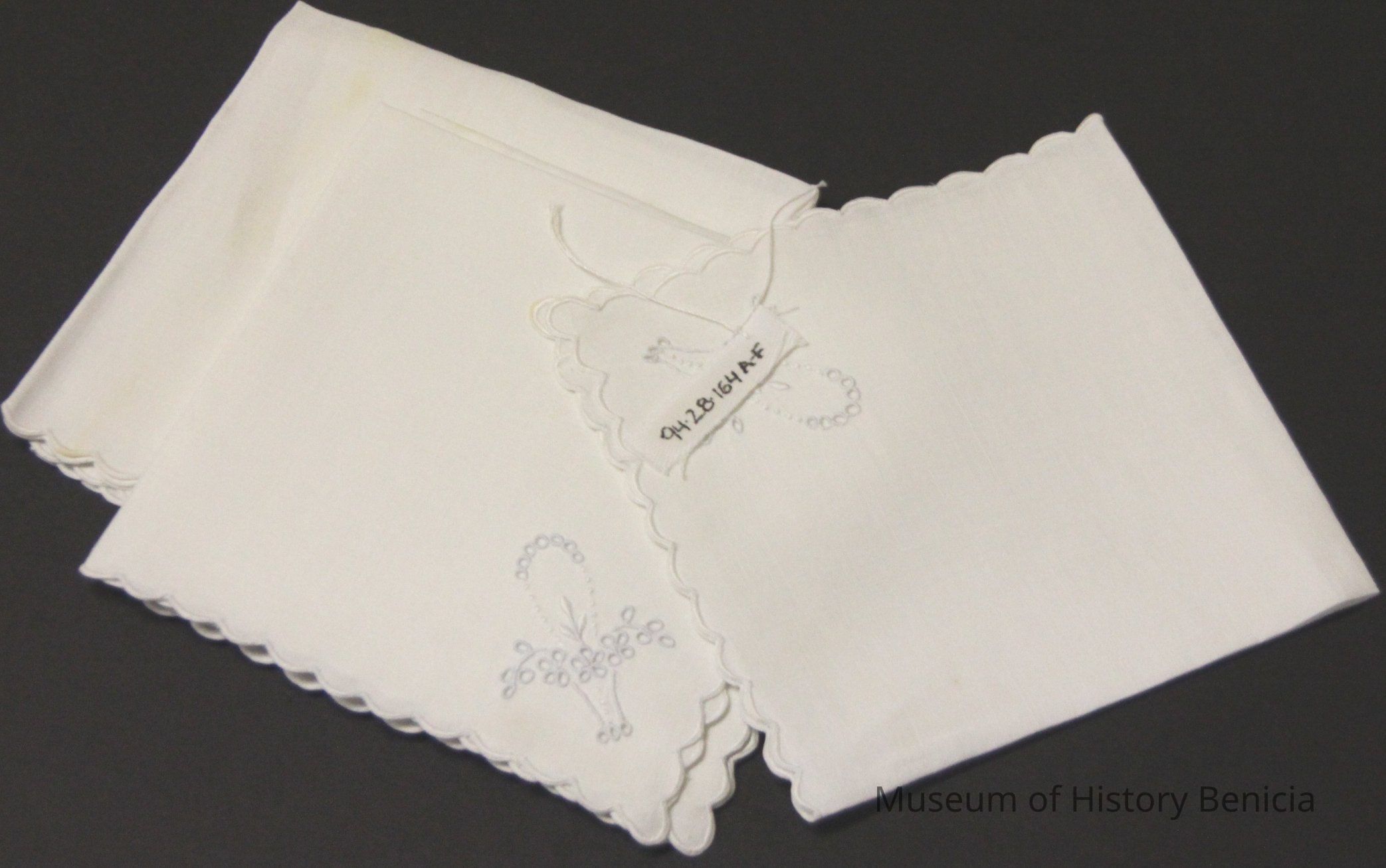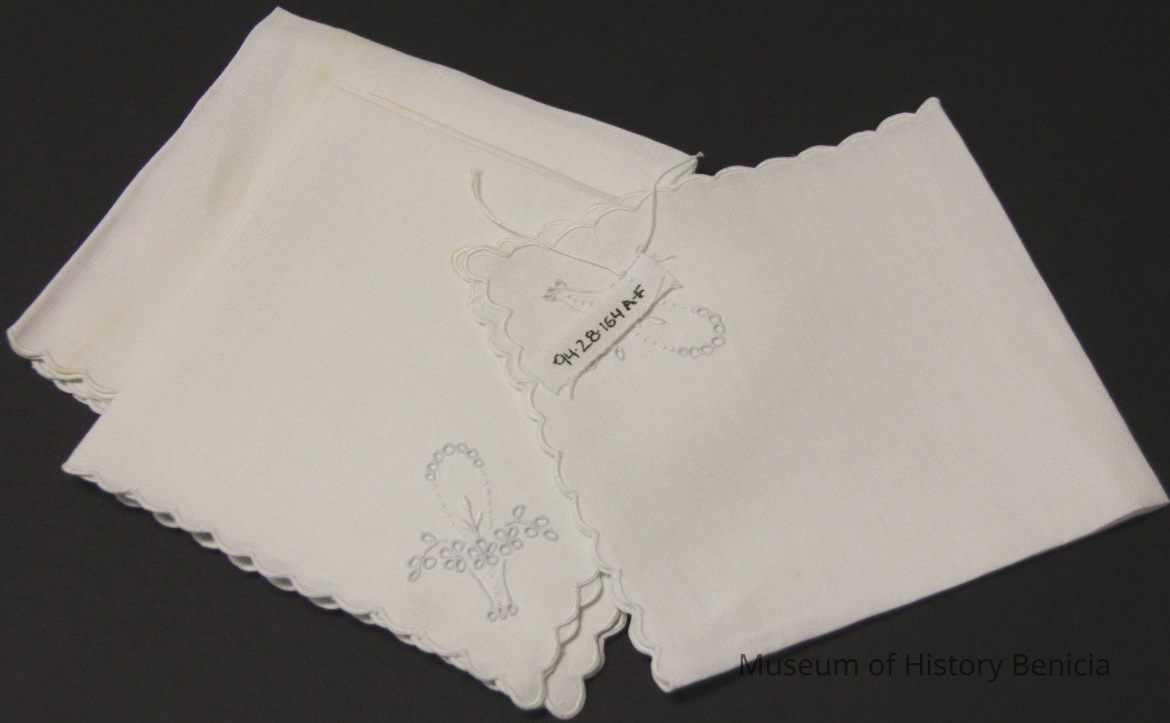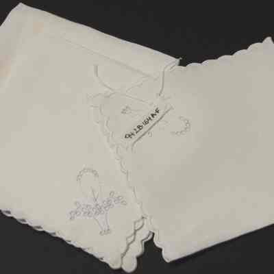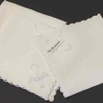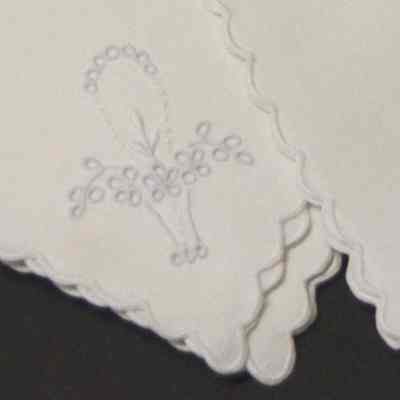 White linen napkins with scalloped border and basket of flowers at one corner. Dessert/bridge napkins. embrodered eyelet.