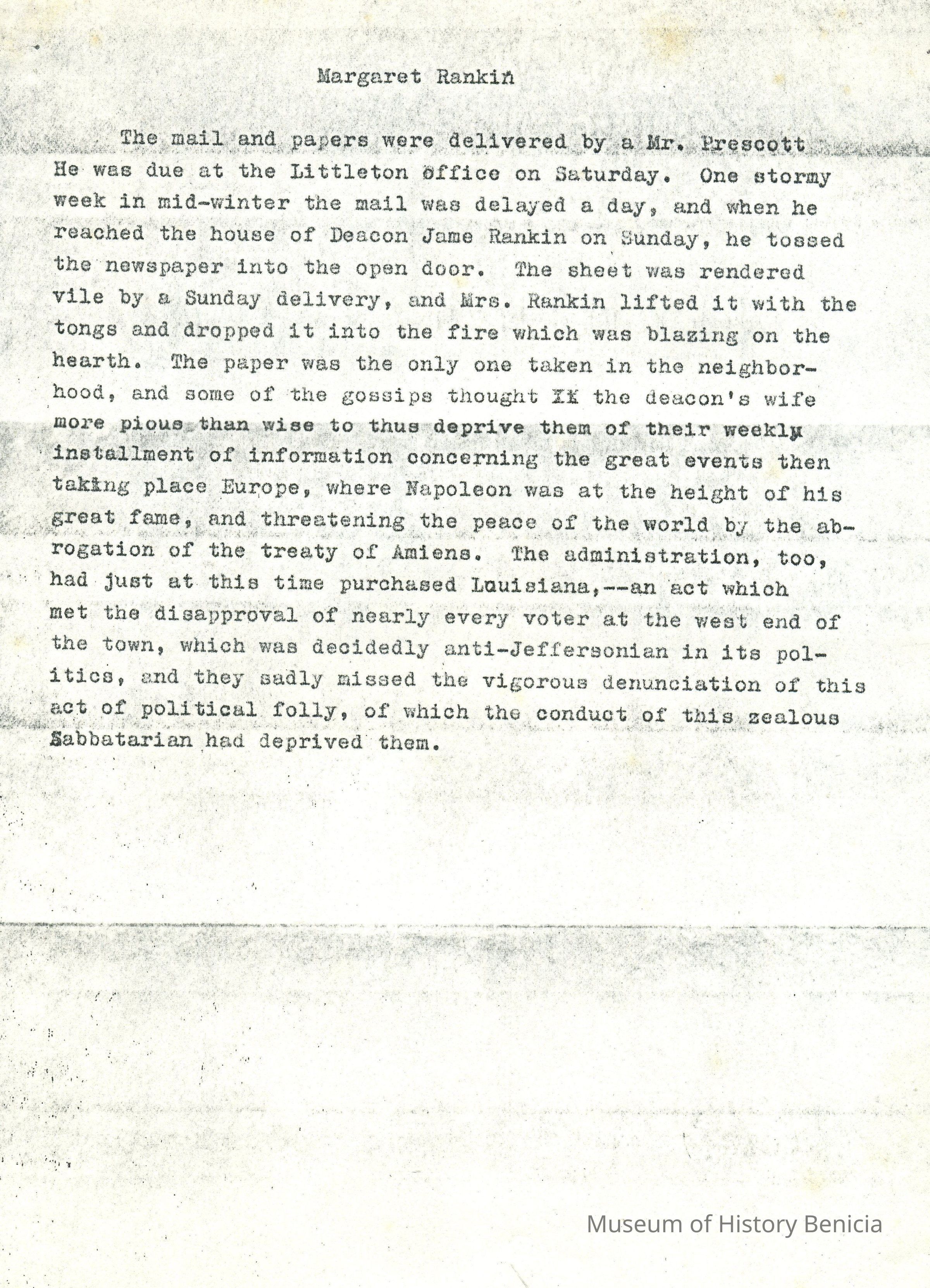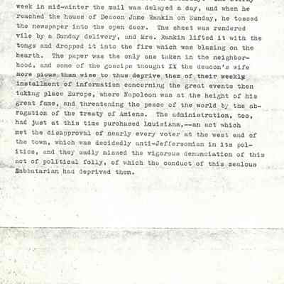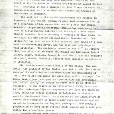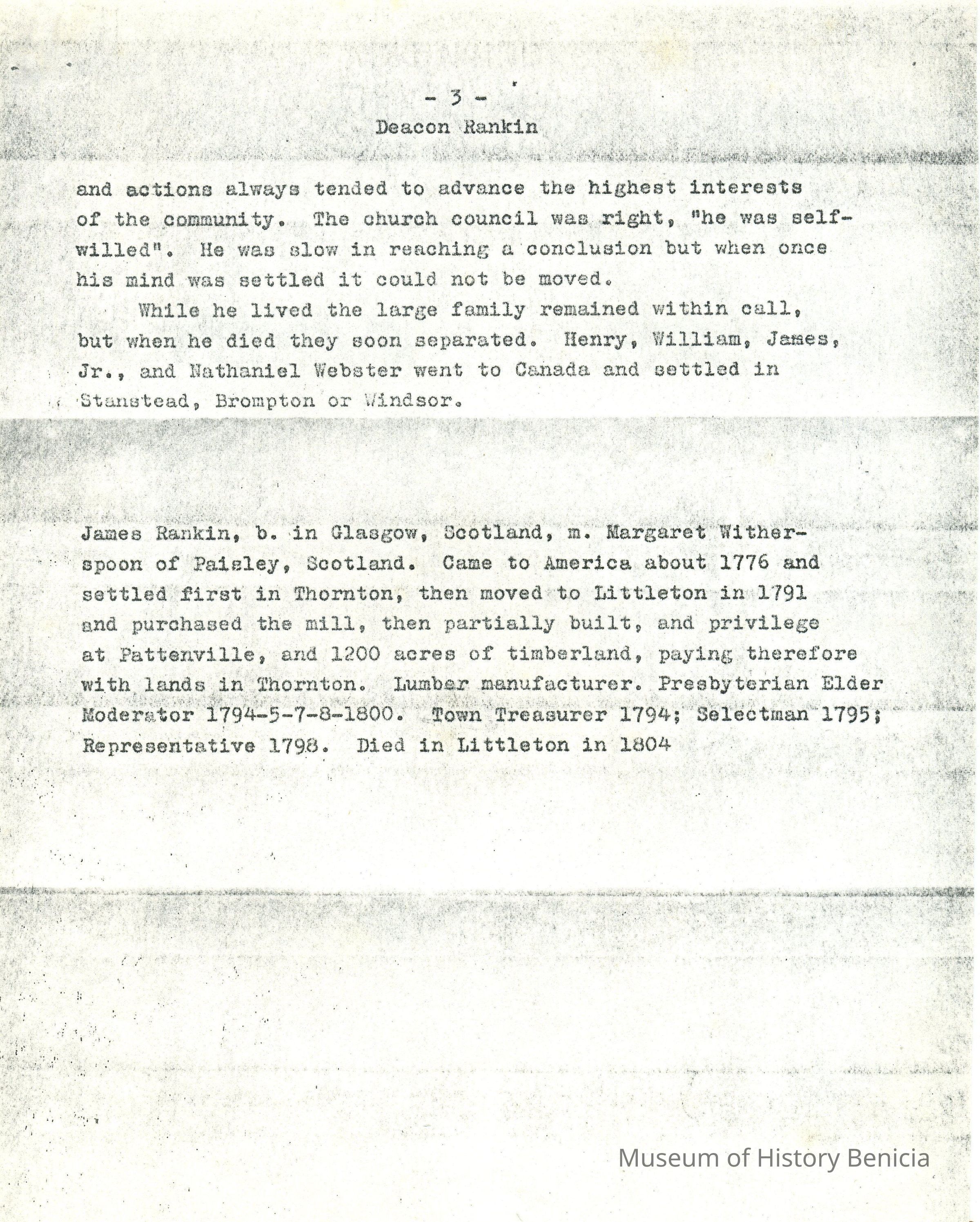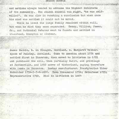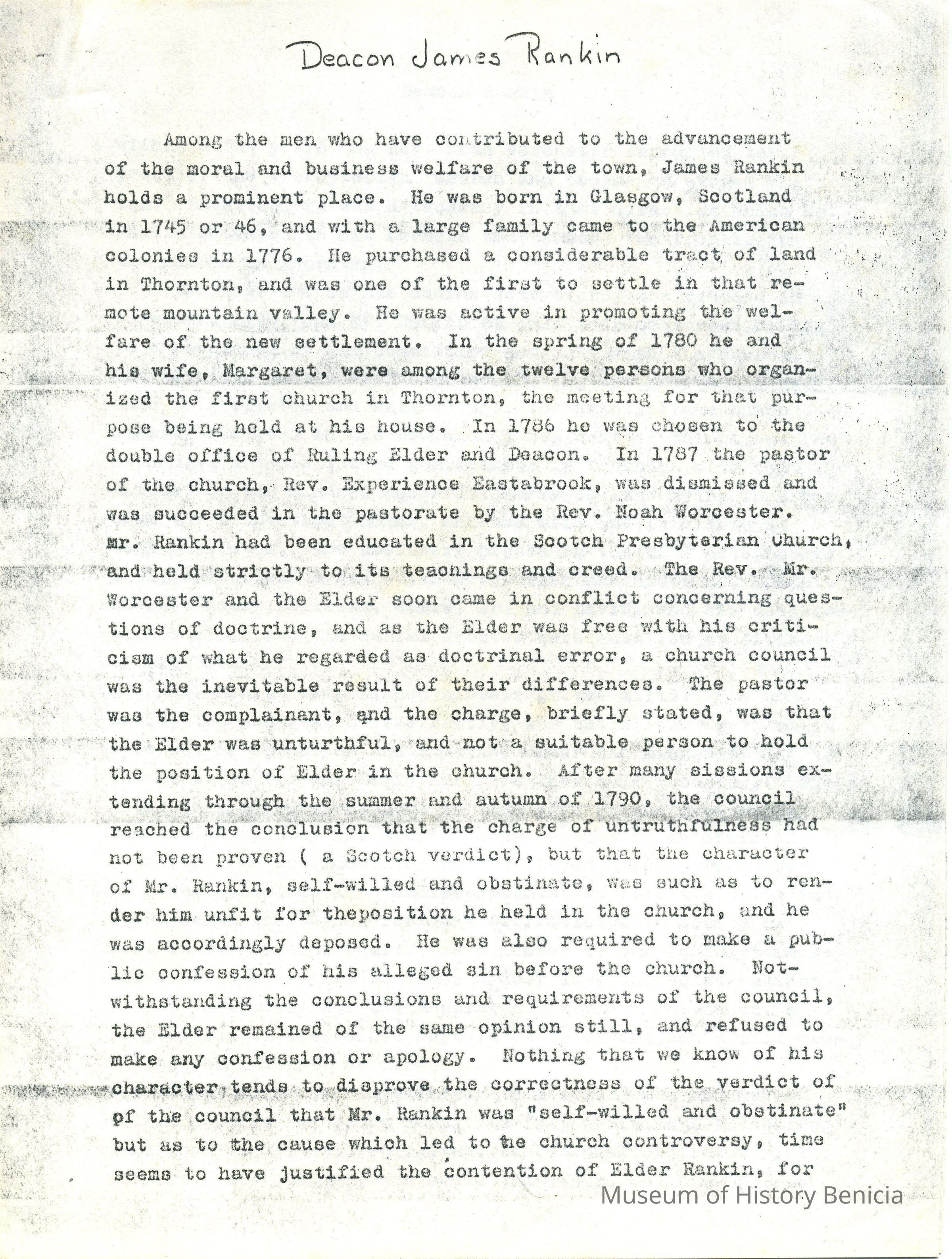 Genealogical Narrative - Information on Deacon James Rankin who was born in Glasgow Scotland in 1745 and came to America in 1776. His location is only listed by cities but he lived in the New England area; the information also contains an anecdote about his wie Margaret.