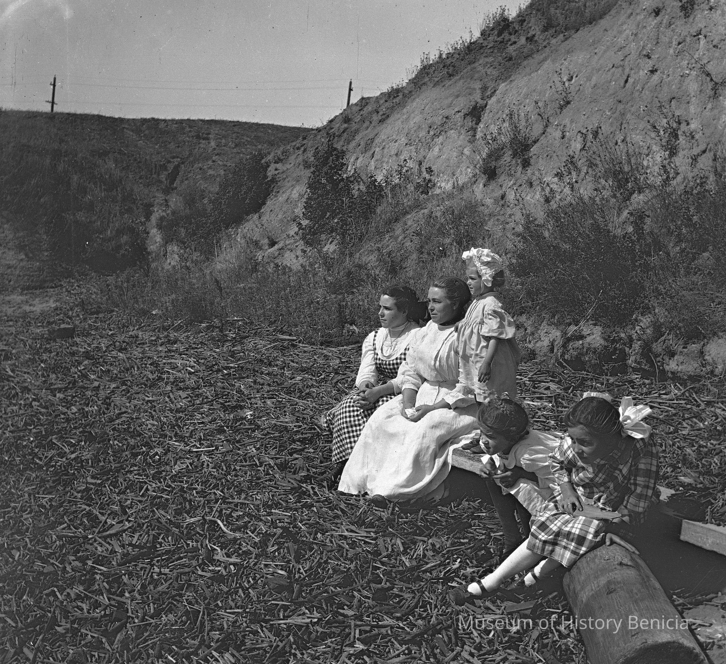 Two women and three children sitting in an open area together. The women are Mary Canessa and Dita Molfino. The children are Violet and Margurite Molfino and an unknown girl.Collection