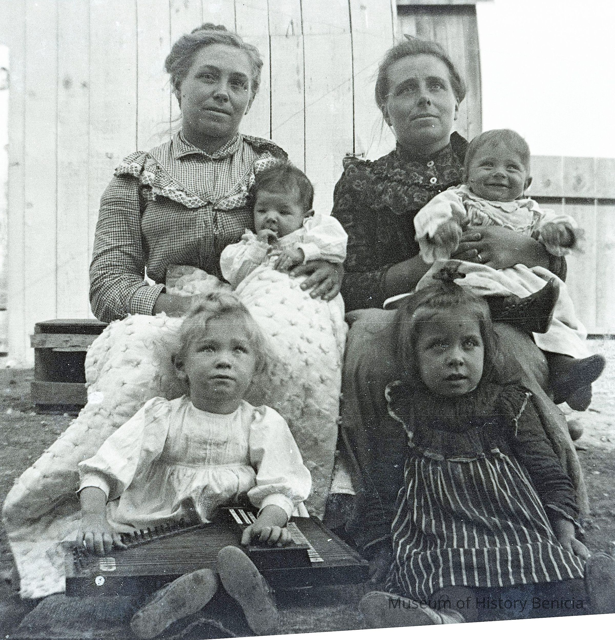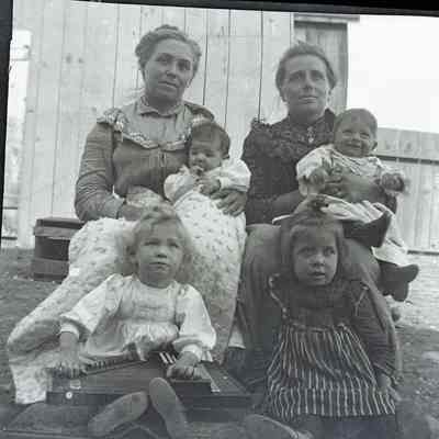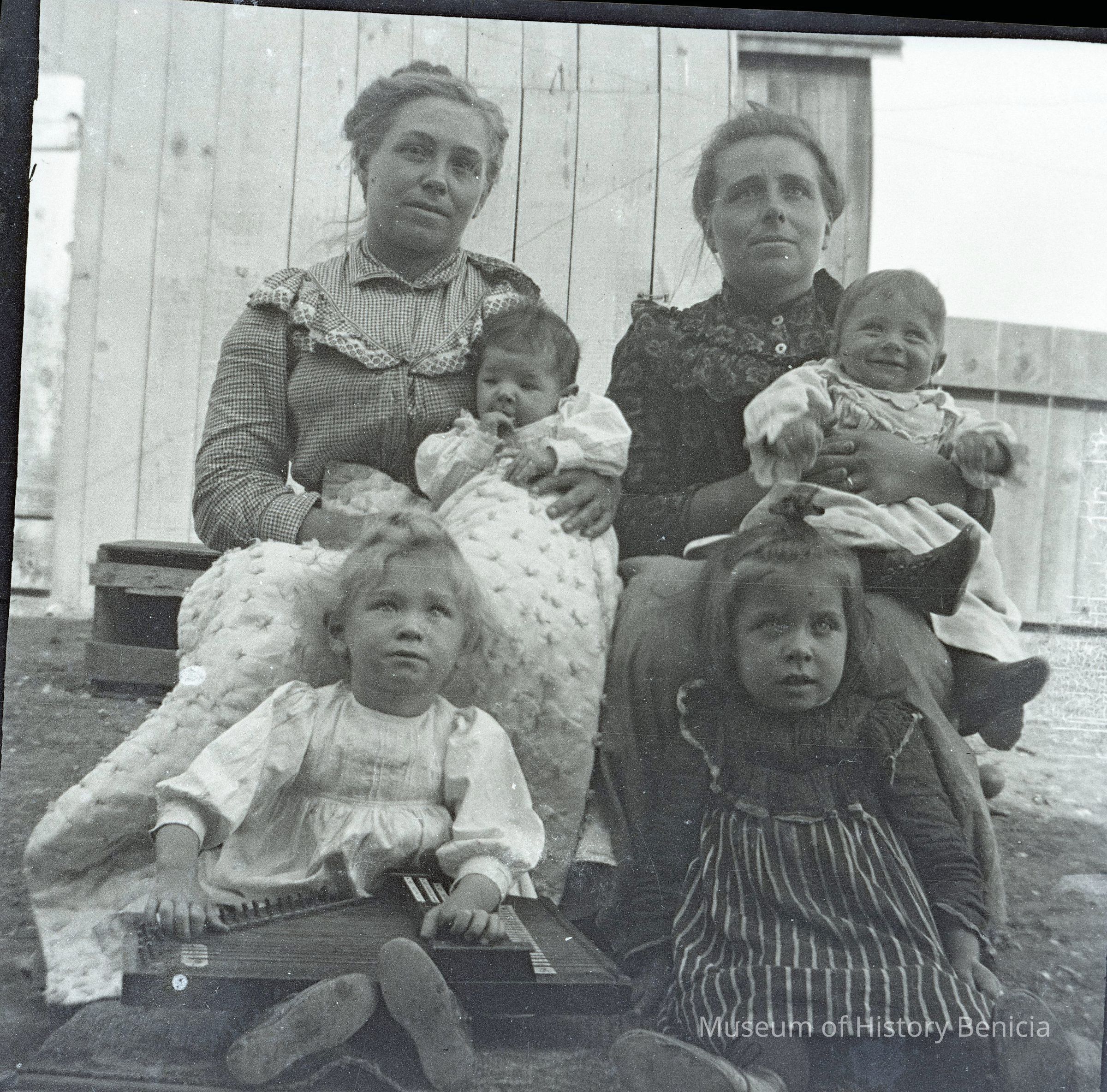 This photo shows two women and their kids sitting on the steps.