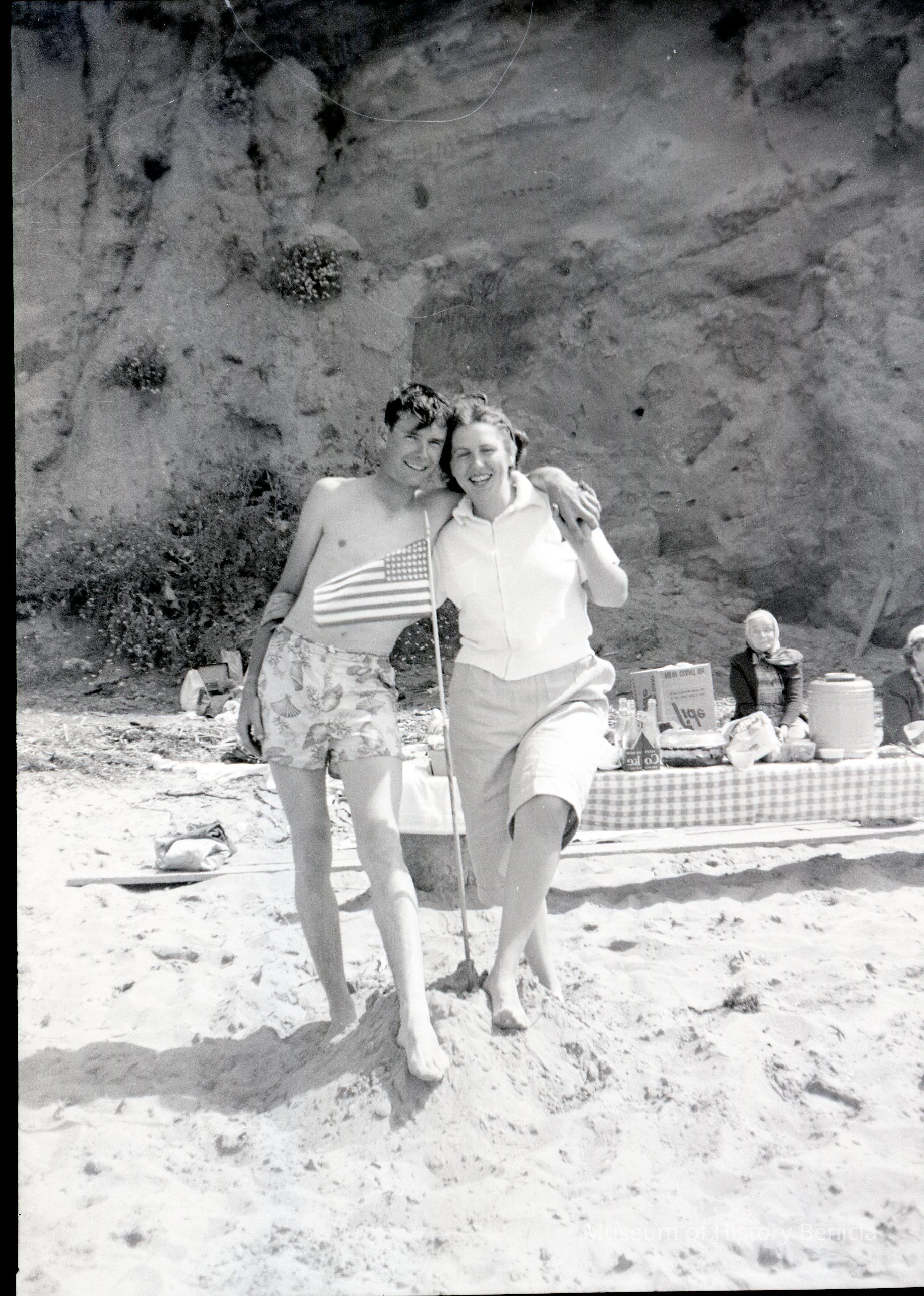 B/W negative of a man and a woman on the beach at Ocean Beach.