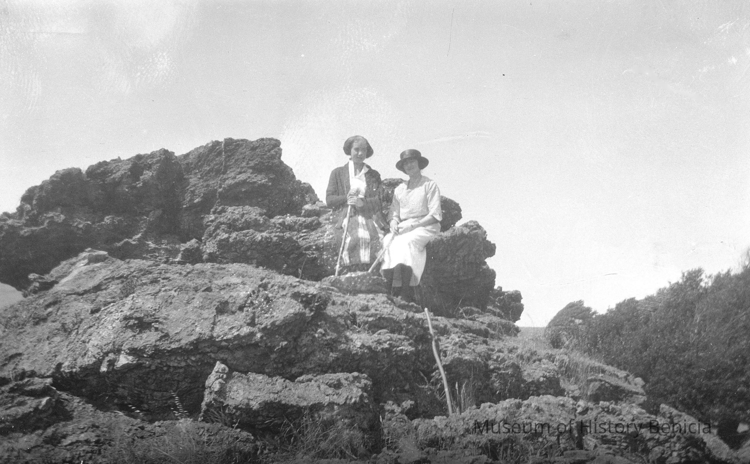 Two women sitting on a rocky outcropping with walking sticks. This may be present day Blue Rock Springs in Vallejo.
