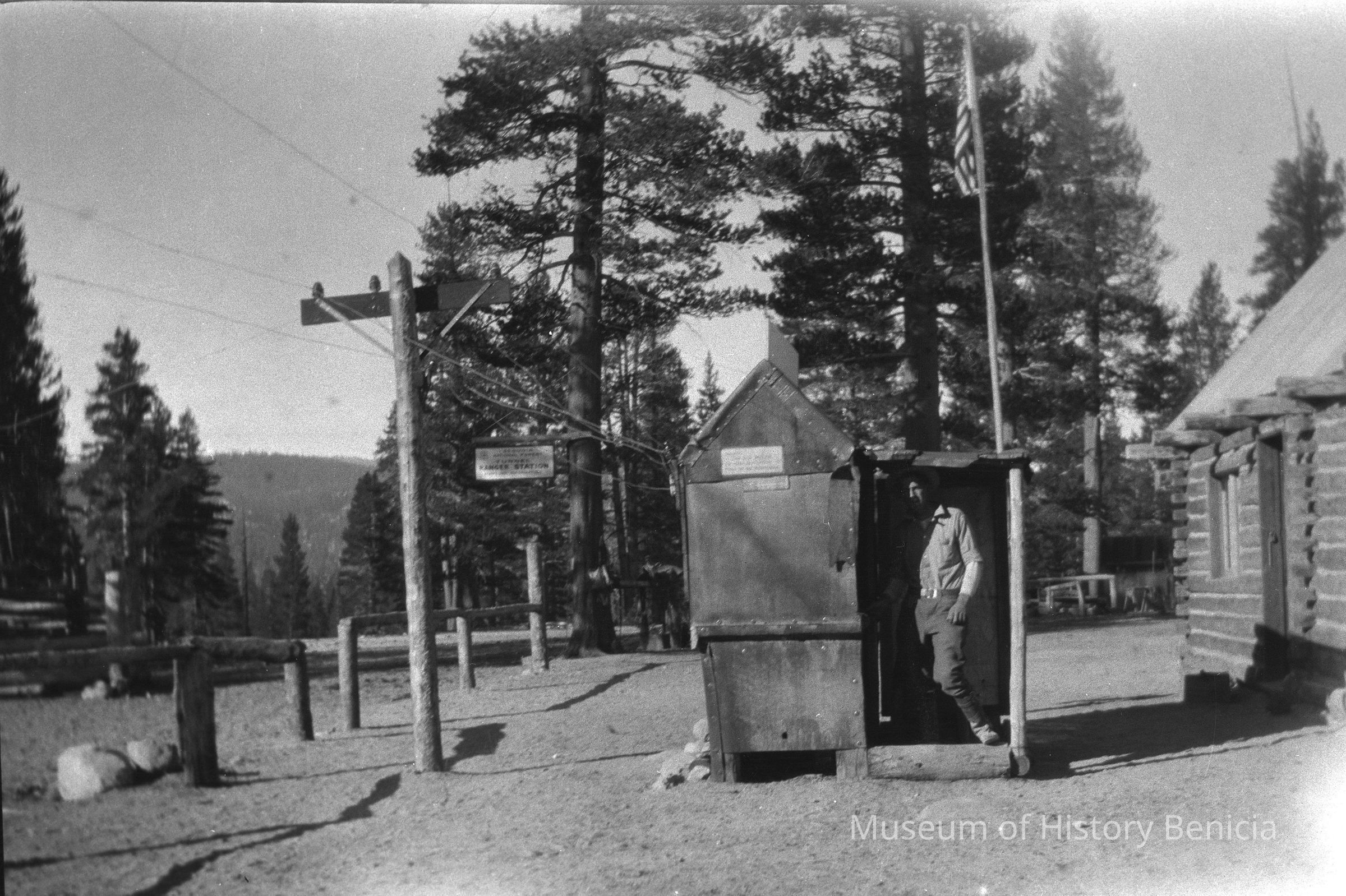 A man sitting next to a small structure, another (larger) structure is behind him. There are trees in the background. Ranger station with a canvas hut (bathroom?) and a man standing next to it.Collection