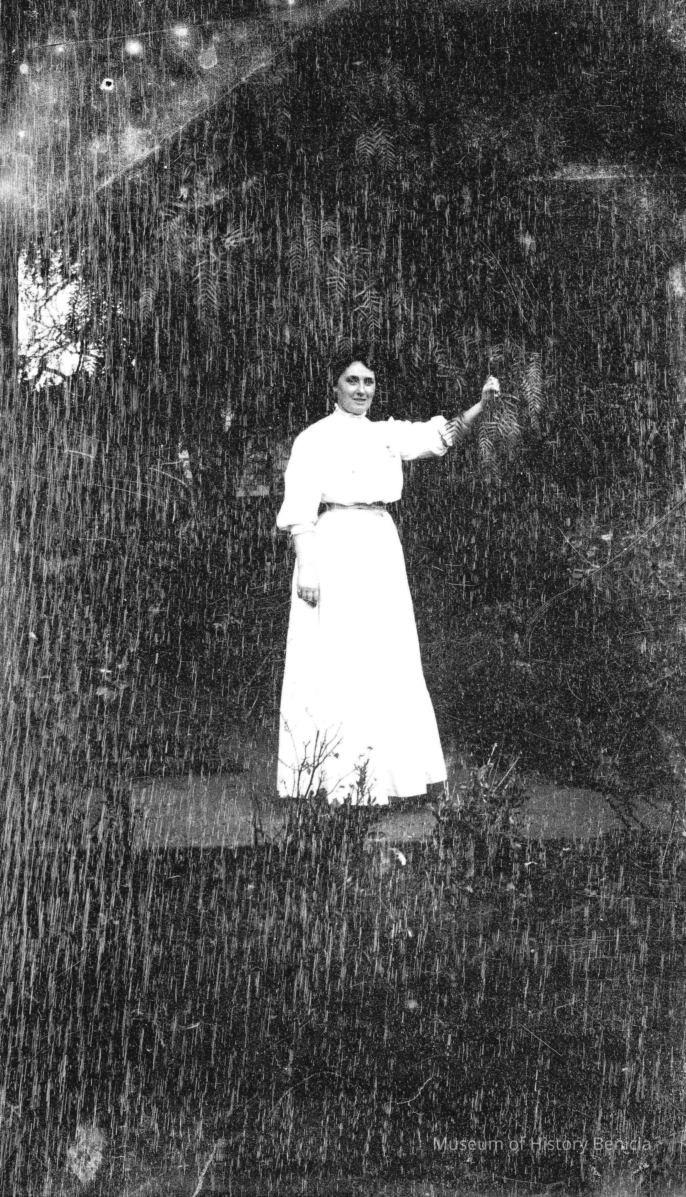 A woman standing in a garden next to a tree. The negative is heavily cracked/crazed.