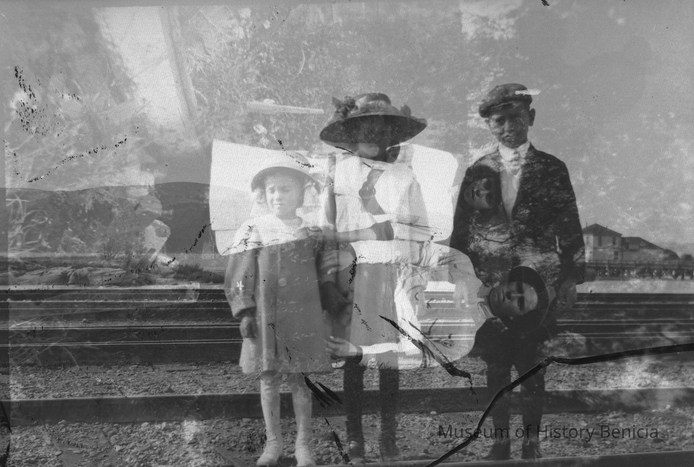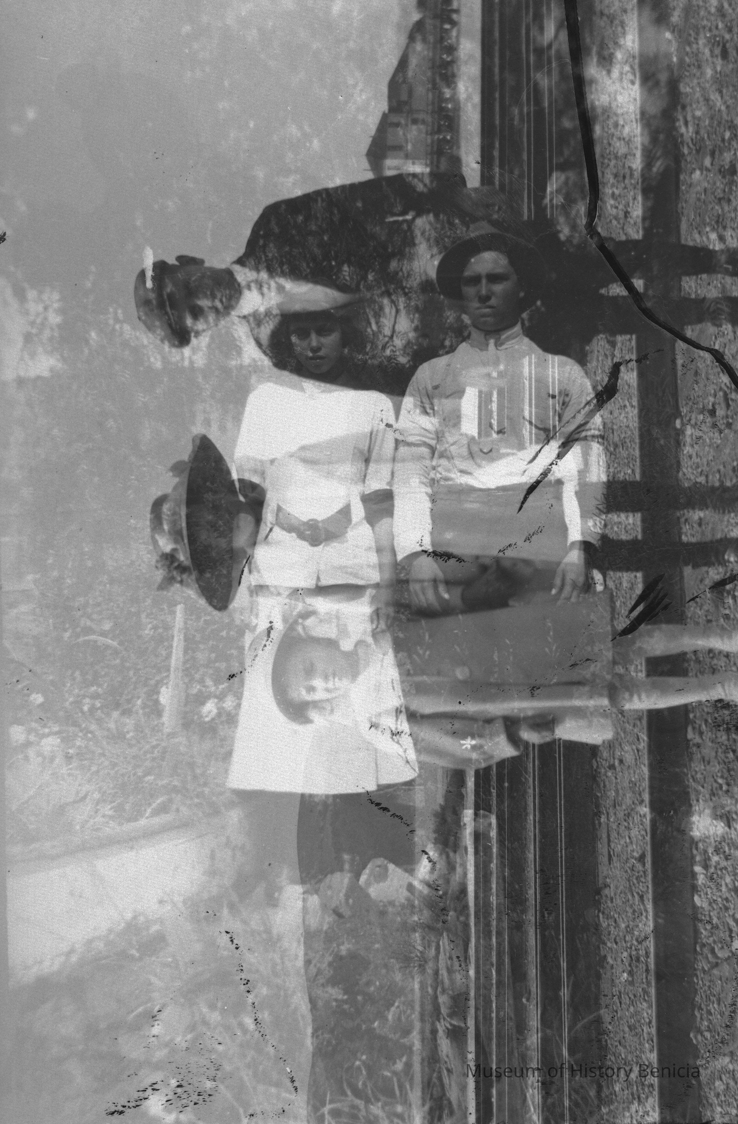 (two negatives stuck together) A man, woman, and child. One is of Violet and Margurite Molfino with a boy near the railroad tracks. There are buildings in the background. The other is a photo of a young man and woman in a garden.Collection