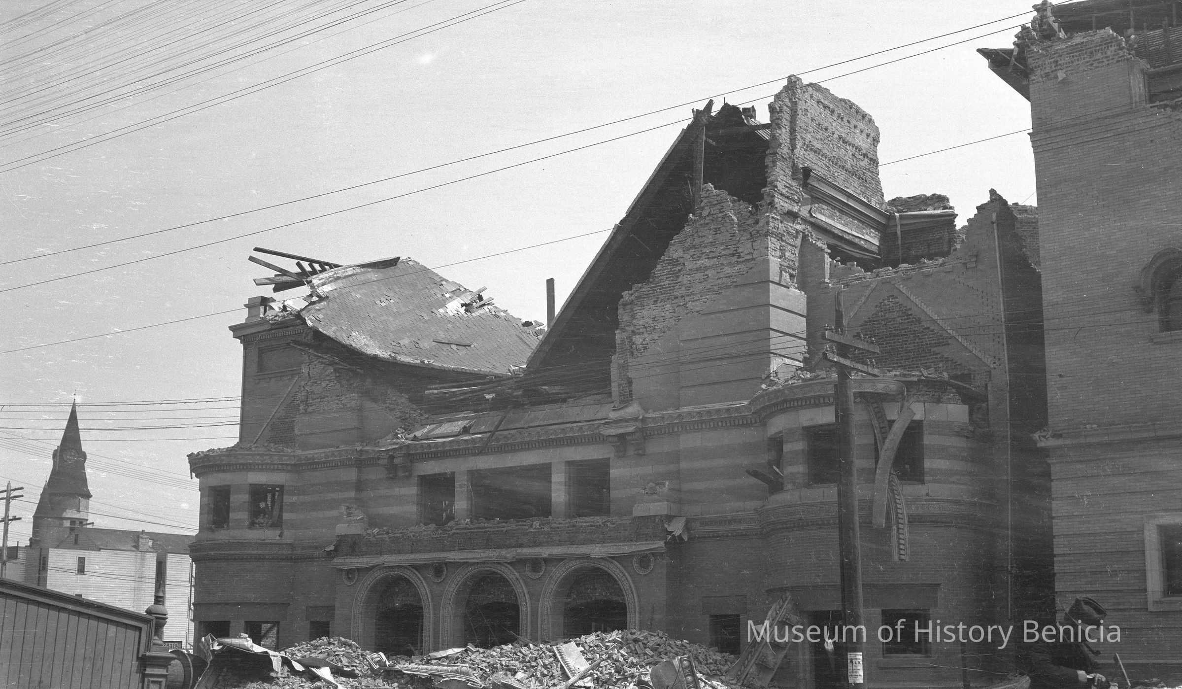San Francisco, 1906. View of destroyed buildings from the earthquakeand fire. 1906 San Francisco earthquake. Hall of Justice and other wrecks. The large building in the center was Temple Beth Israel, which was later rebuilt. However, the building burned in 1989 shortly before the earthquake.Collection