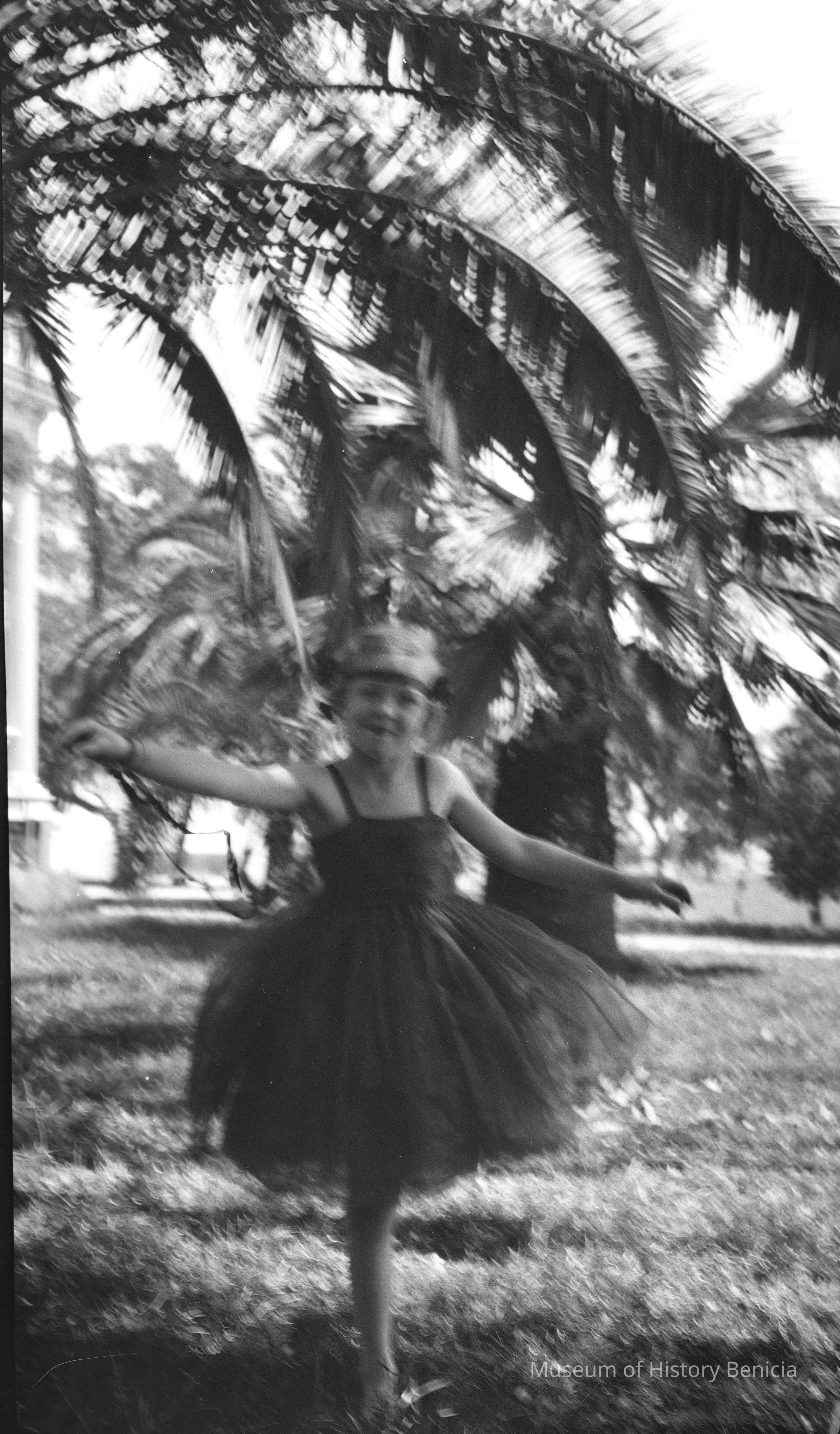 A girl in a fluddy skirt (tutu?) dancing. Young girl in costume at the Commandants Residence(?).