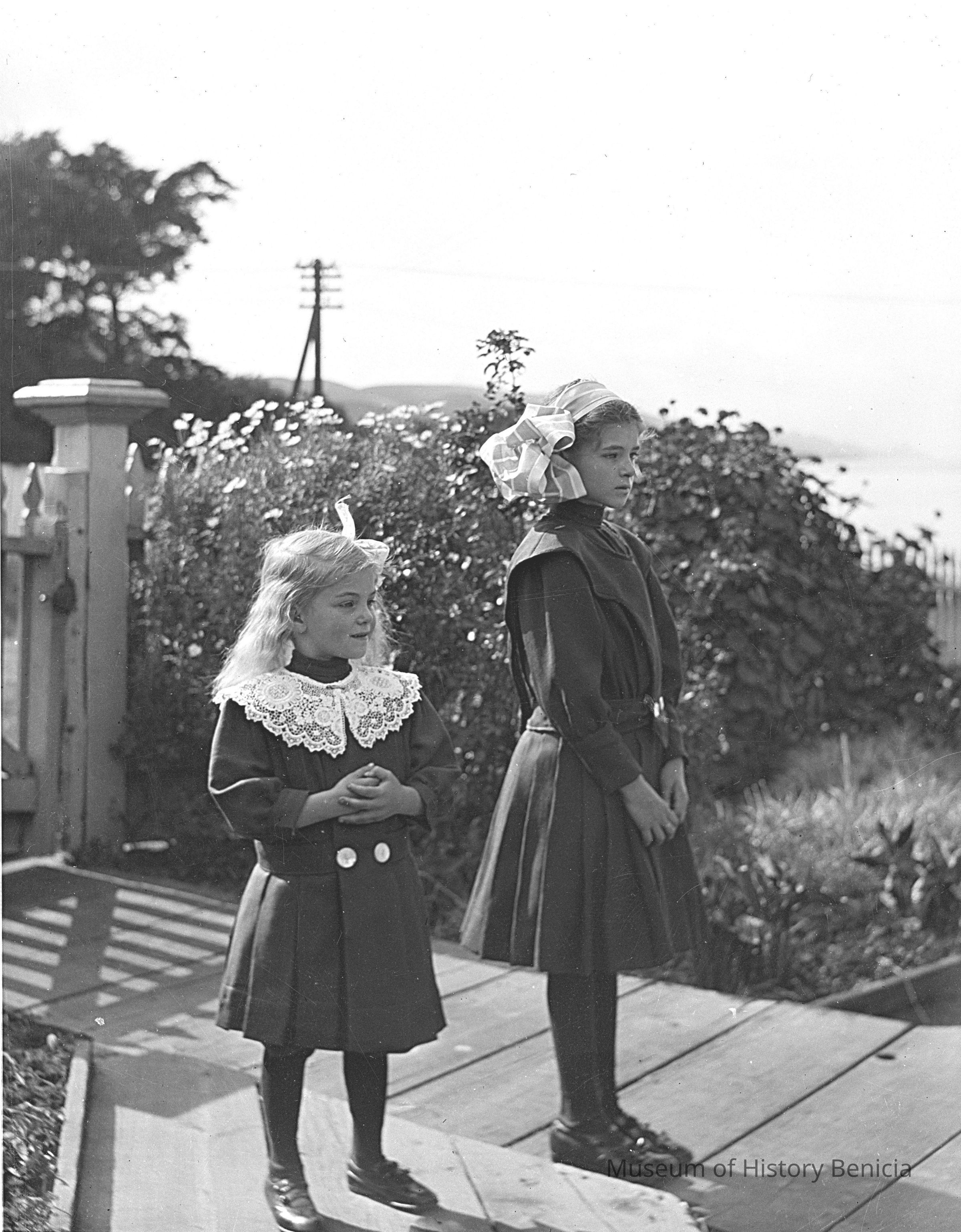 Two girls stiffly posed on a deck. The girls are Violet (left) and Margurite (right) Molfino. They seem to be standing in front of their house at West "H" and 3 rd street in Benicia.Collection