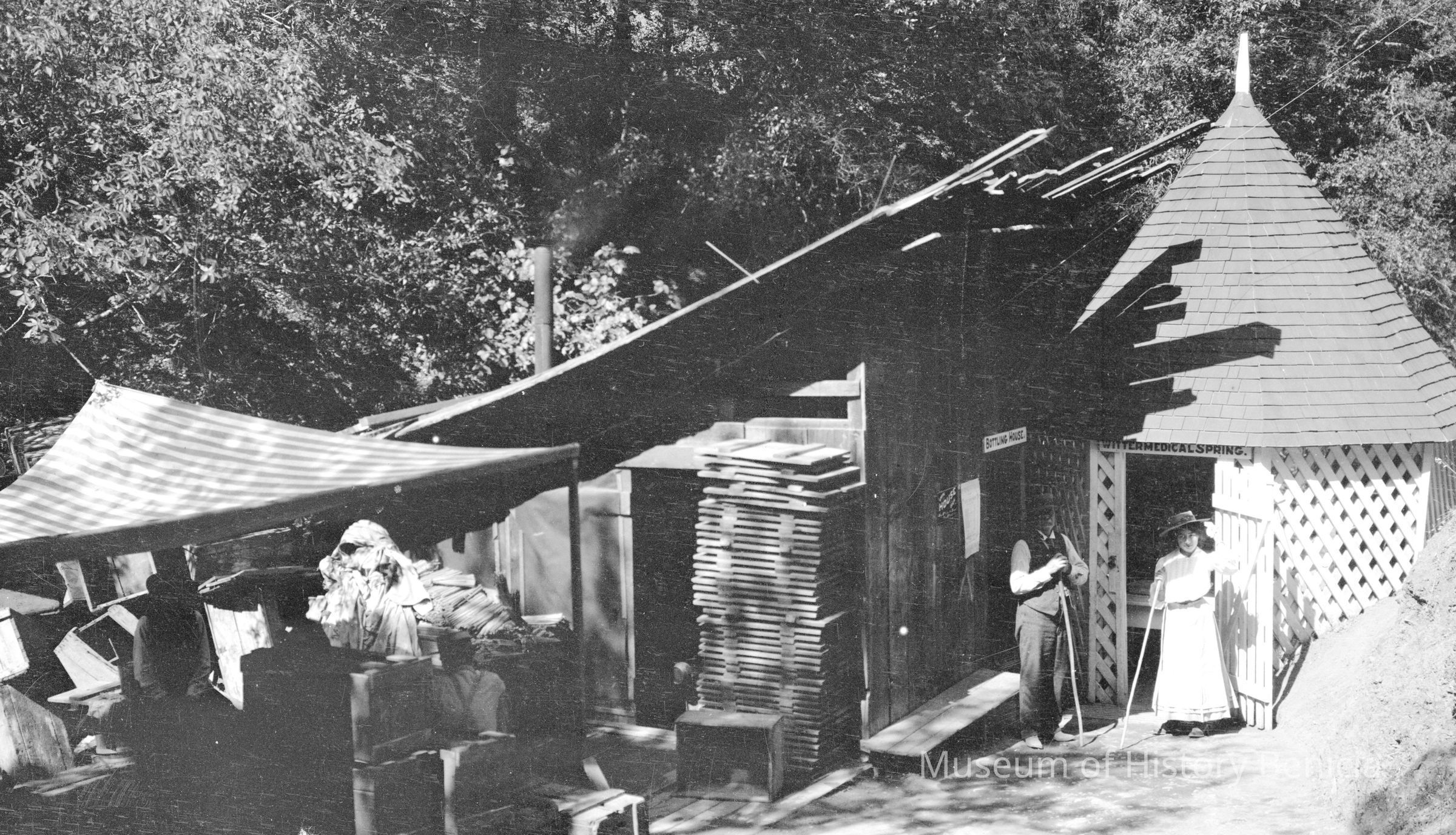 Saratoga Springs vacation. Saratoga Springs vacation. Gazebo and other buildings. Signs say Witter Medical Springs bottling house. Man and woman standing in front.Collection