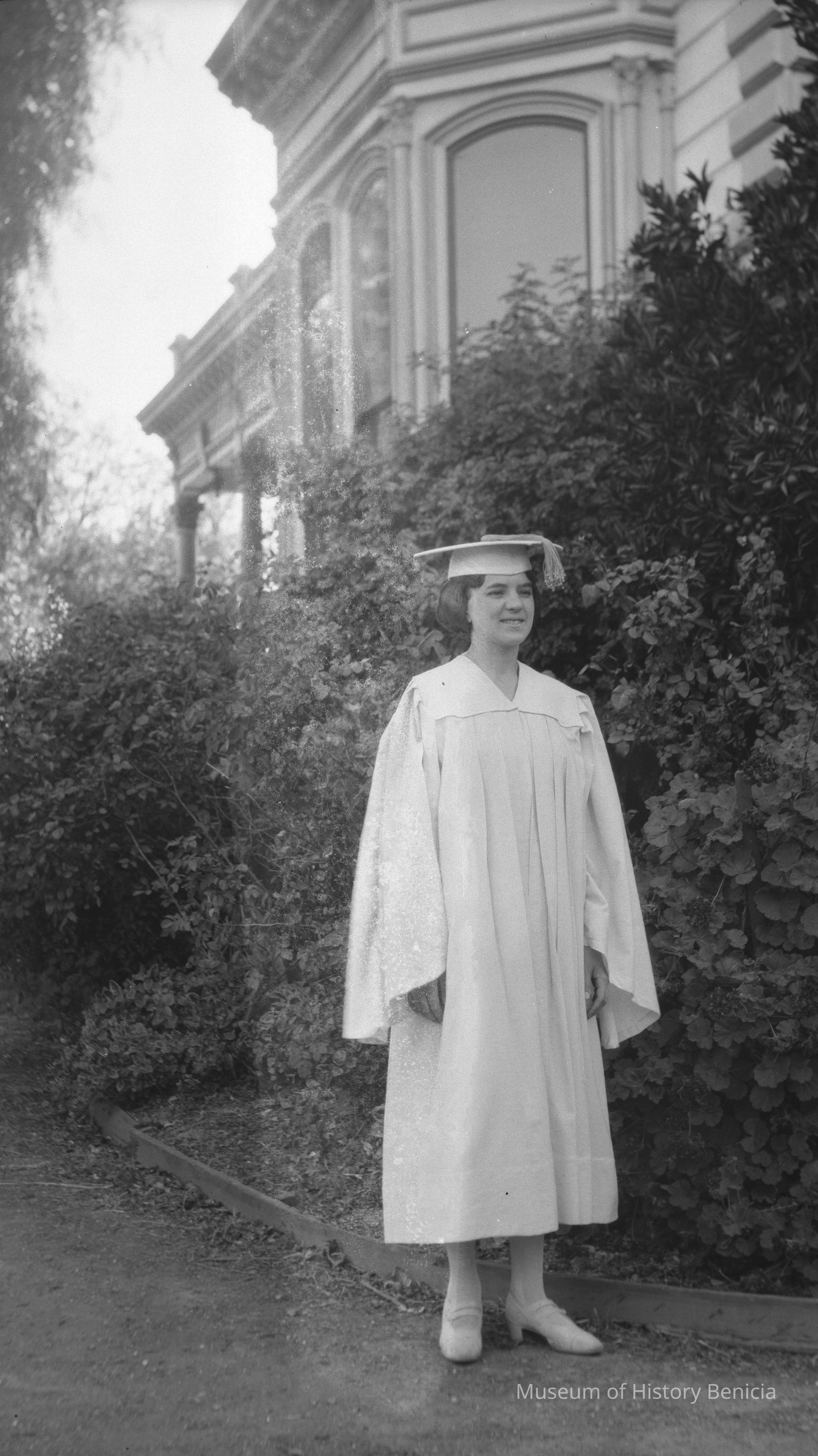 Closer view of a girl in a graduation cap and gown. (same girl as in 2004.001.0782). This is Margurite Molfino in front of the Hastings mansion.Collection