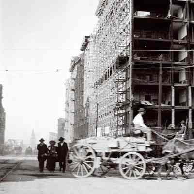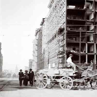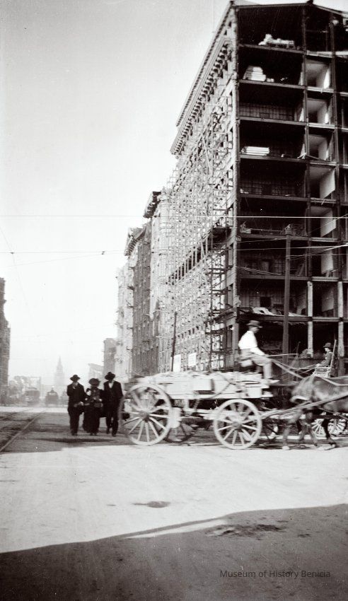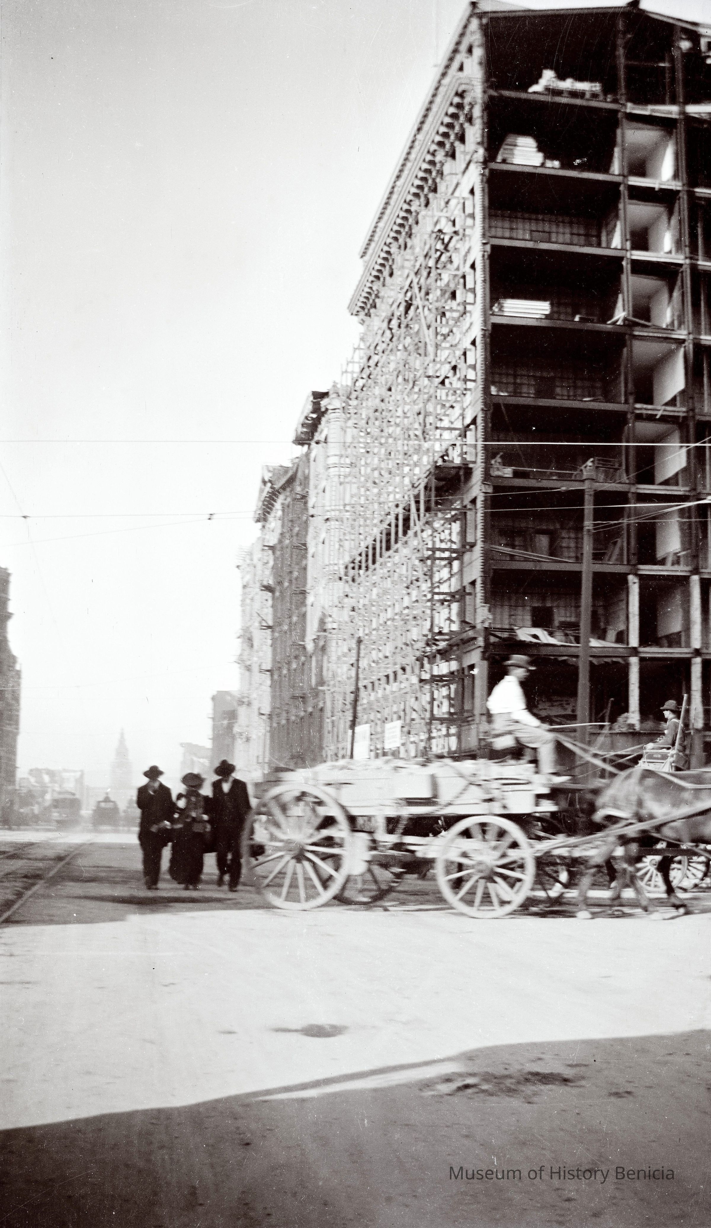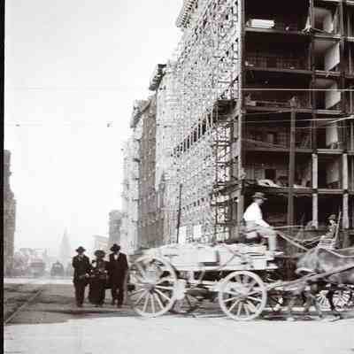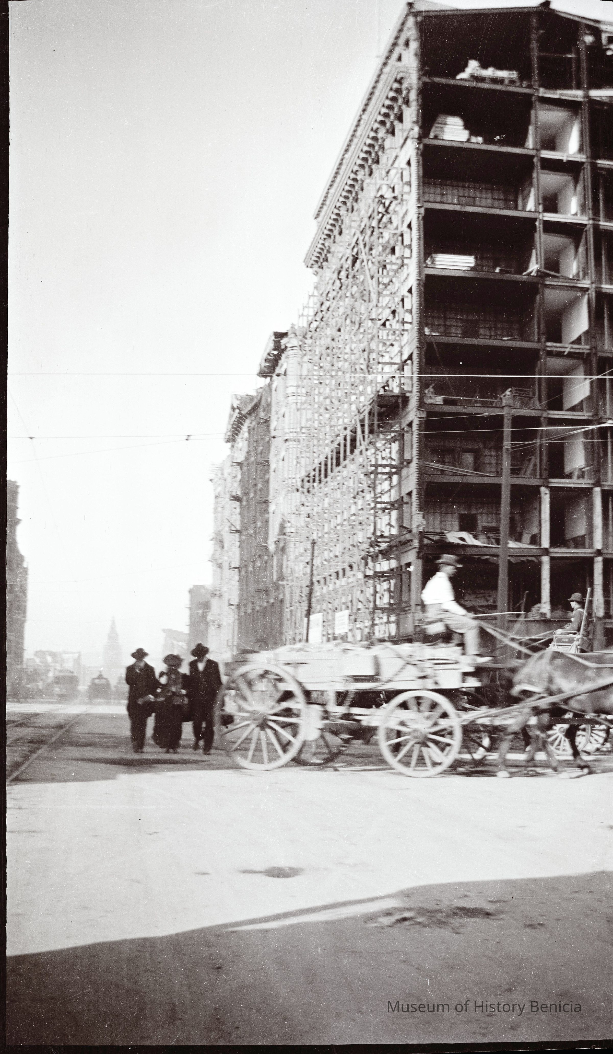 This photo is one of a series of photos of San Francisco after the 1906 earthquake. It shows the start of the city rebuilding. There is a man driving a wagon and three people walking up the street next to the trolley lines.Collection