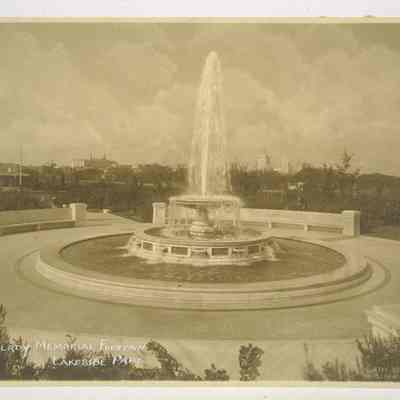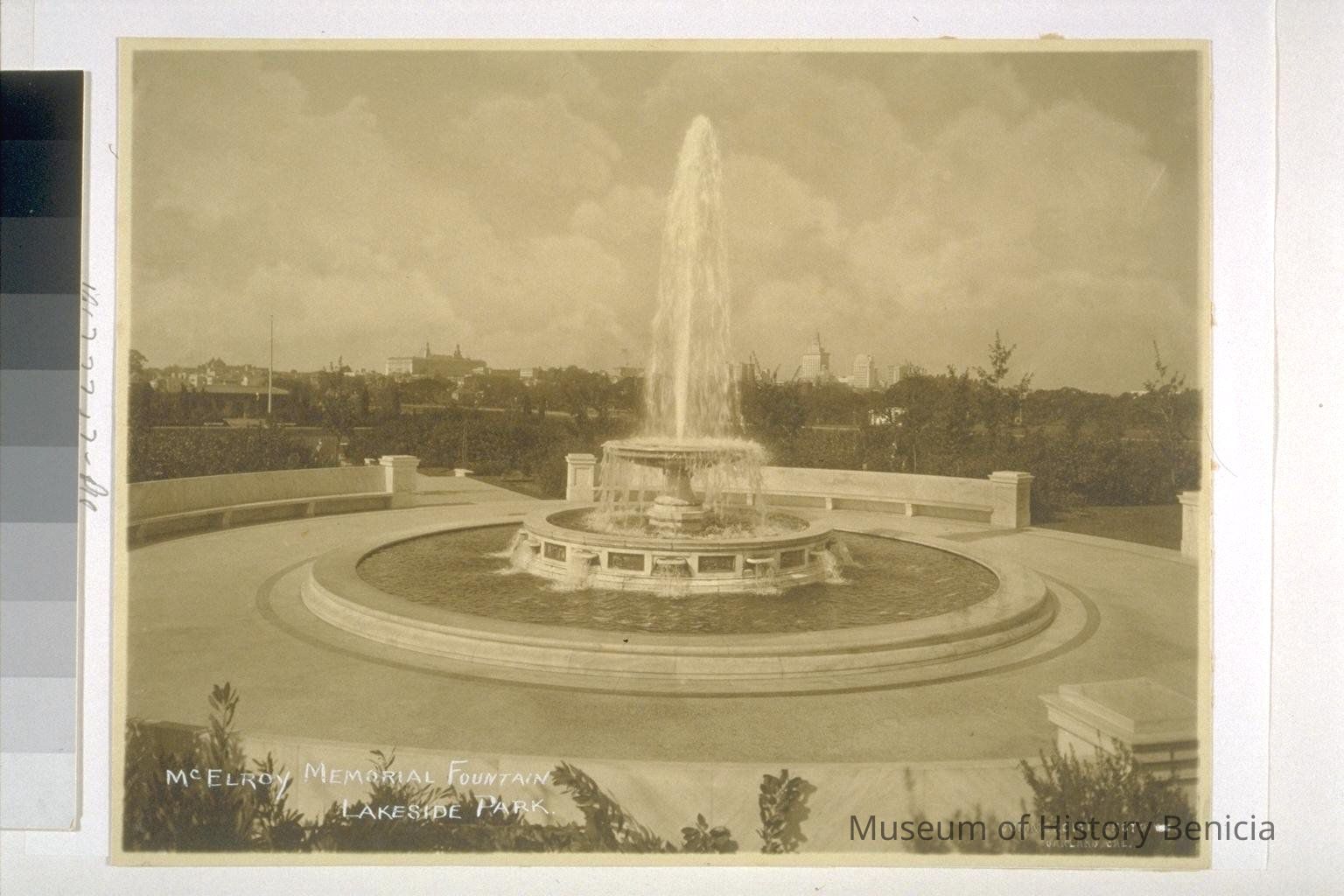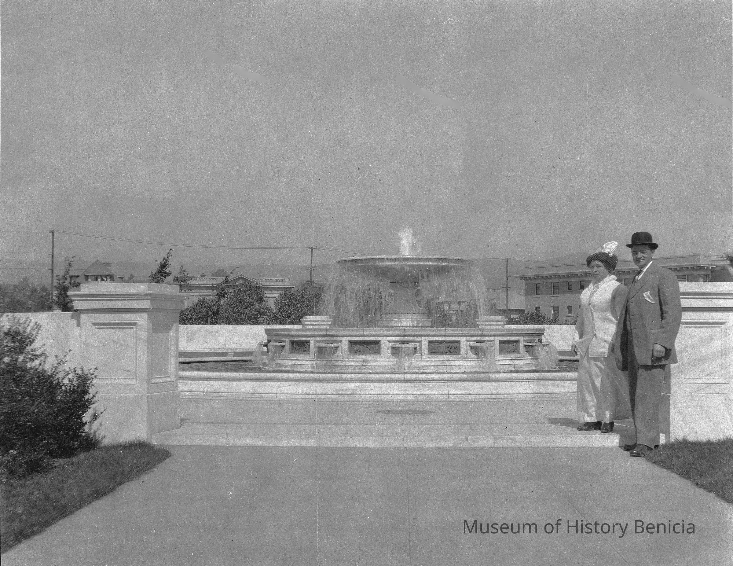 A couple standing next to a water fountain. The couple is John and Dita Molfino. They are standing in front of McElroy Memorial Fountain in Lakeside Park in Oakland. The images include a download of a photo in the Bancroft collection which identifies the fountain. This second photo is NOT by John Molfino and is not in our collection. It is used only for identification purposes.Collection