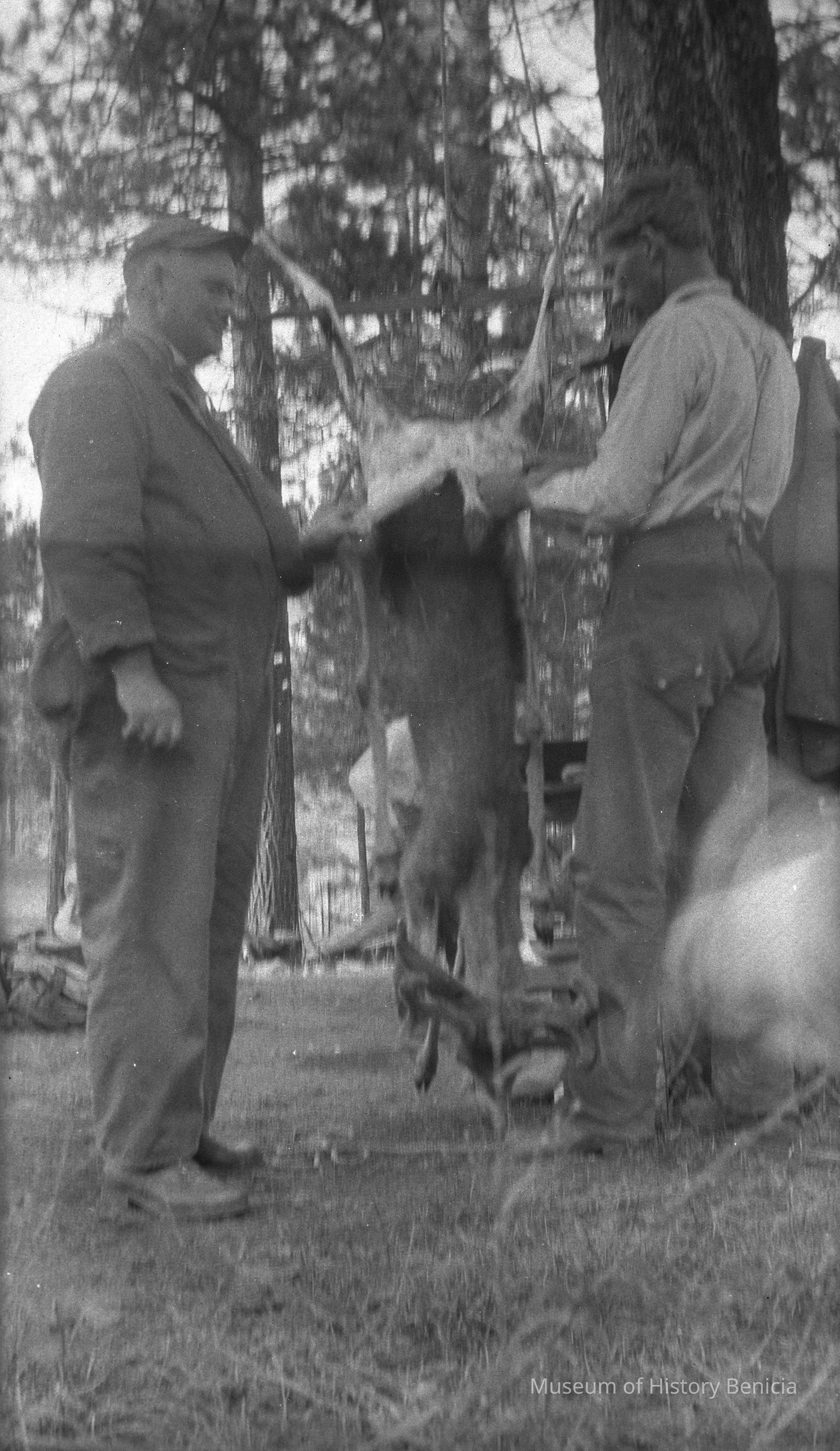 Two men standing beside a dead deer hanging upside down.