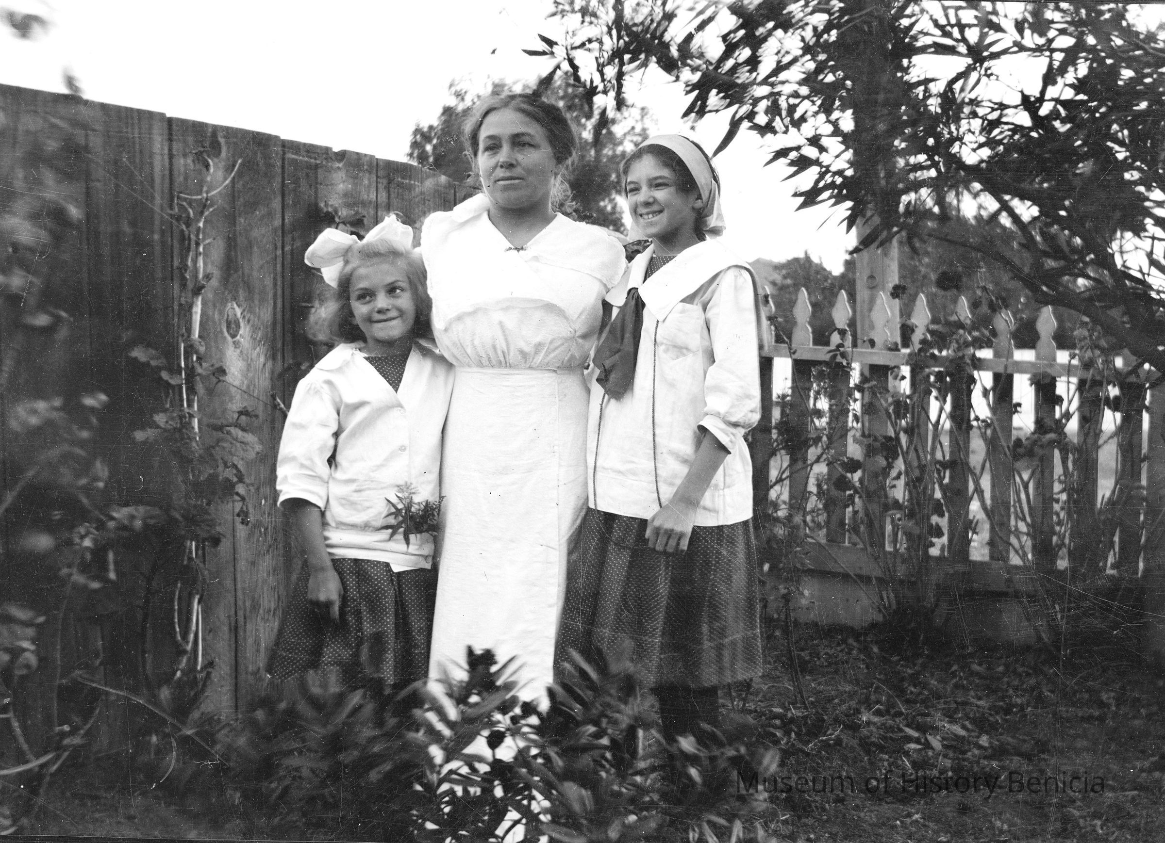 A woman standing with her arms around two girls. Dita, Violet and Marguerite Molfino in front yard.