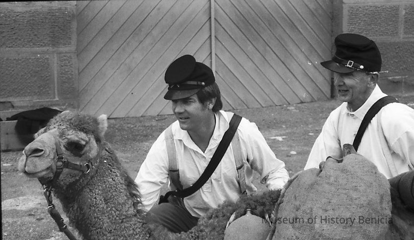 B/W negative Larry Rogers and Dave Stevens (Civil War buffs) at Camel Barn Museum outside with Atar the camel