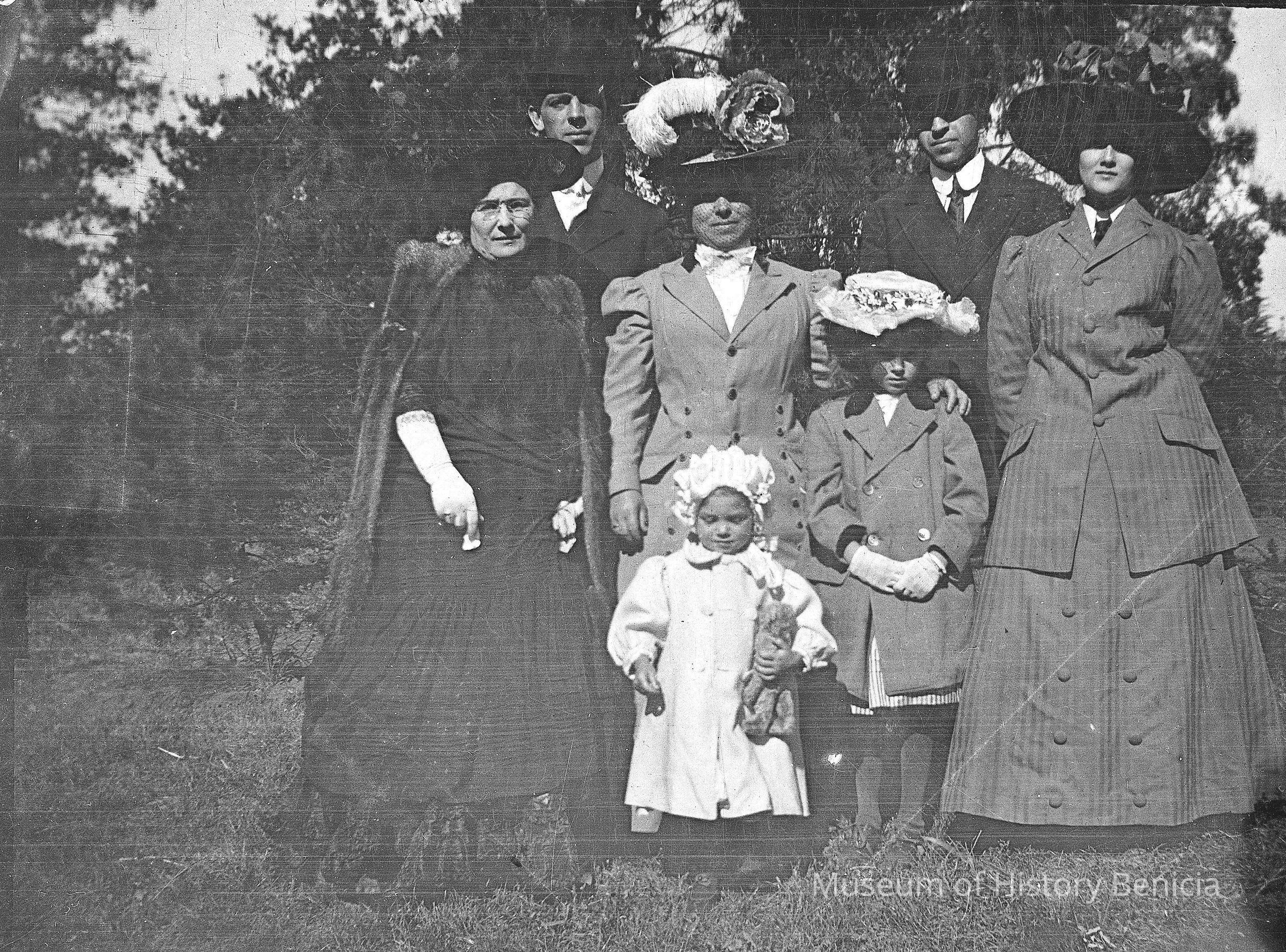 A group of men, women, and children standing outside together. The older woman in the center is Dita Molfino and the two girls are Violet and Margurite Molfino.Collection
