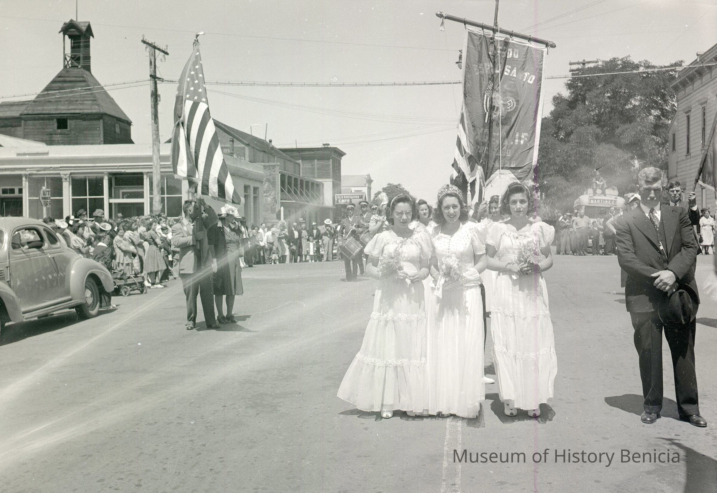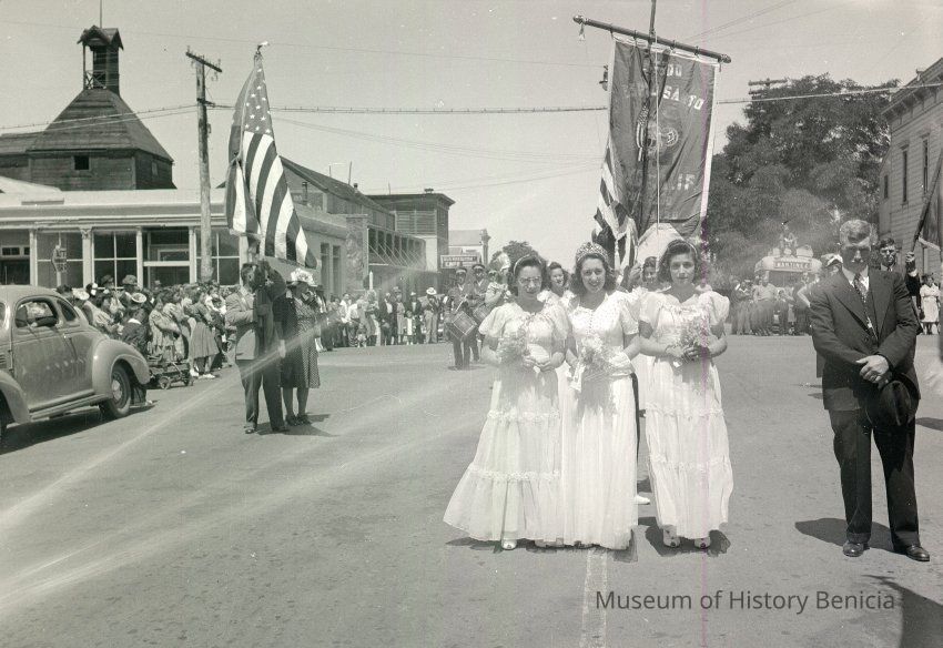 B/W negative of a Holy Ghost parade on First & "H" Streets looking west. California House and Benicia Brewery in left background