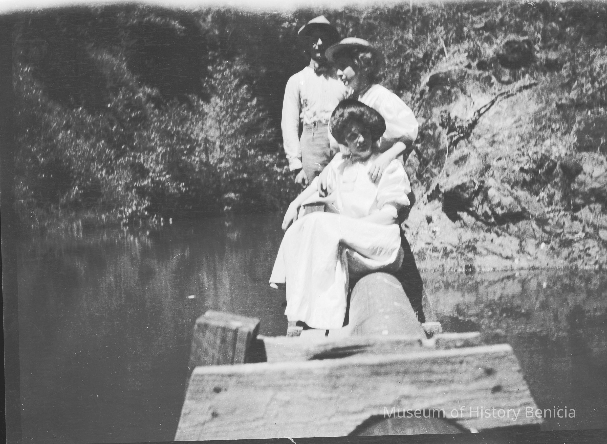This negative shows three people on a boat dock.