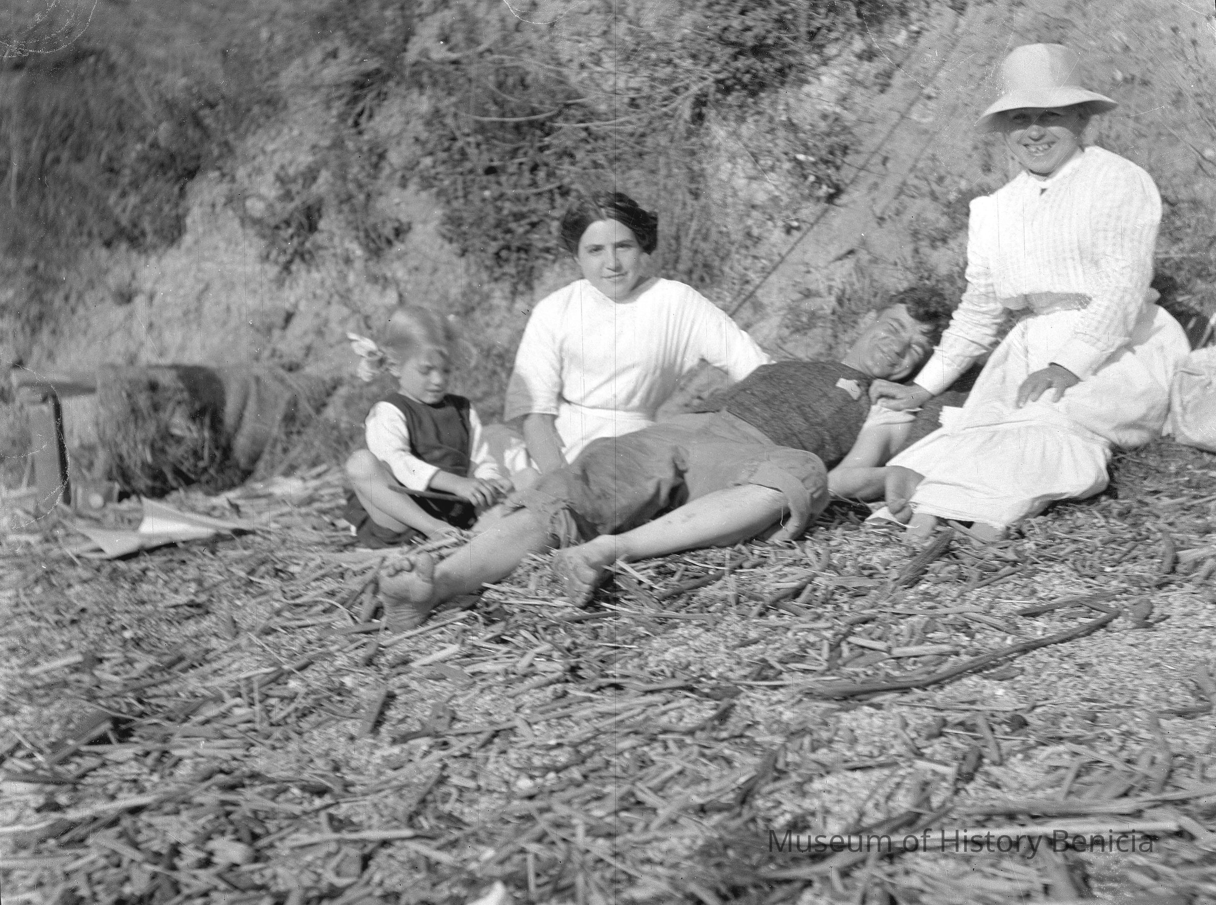 Two women, one man, and a young girl having a picnic. The older woman is Dita Molfino with her husband John and young daughter Violet. The young woman is Mary Canessa who is related to the Molfino's and stayed with them while going to school (per Ralpha June Crause - John Molfino's granddaughter).Collection