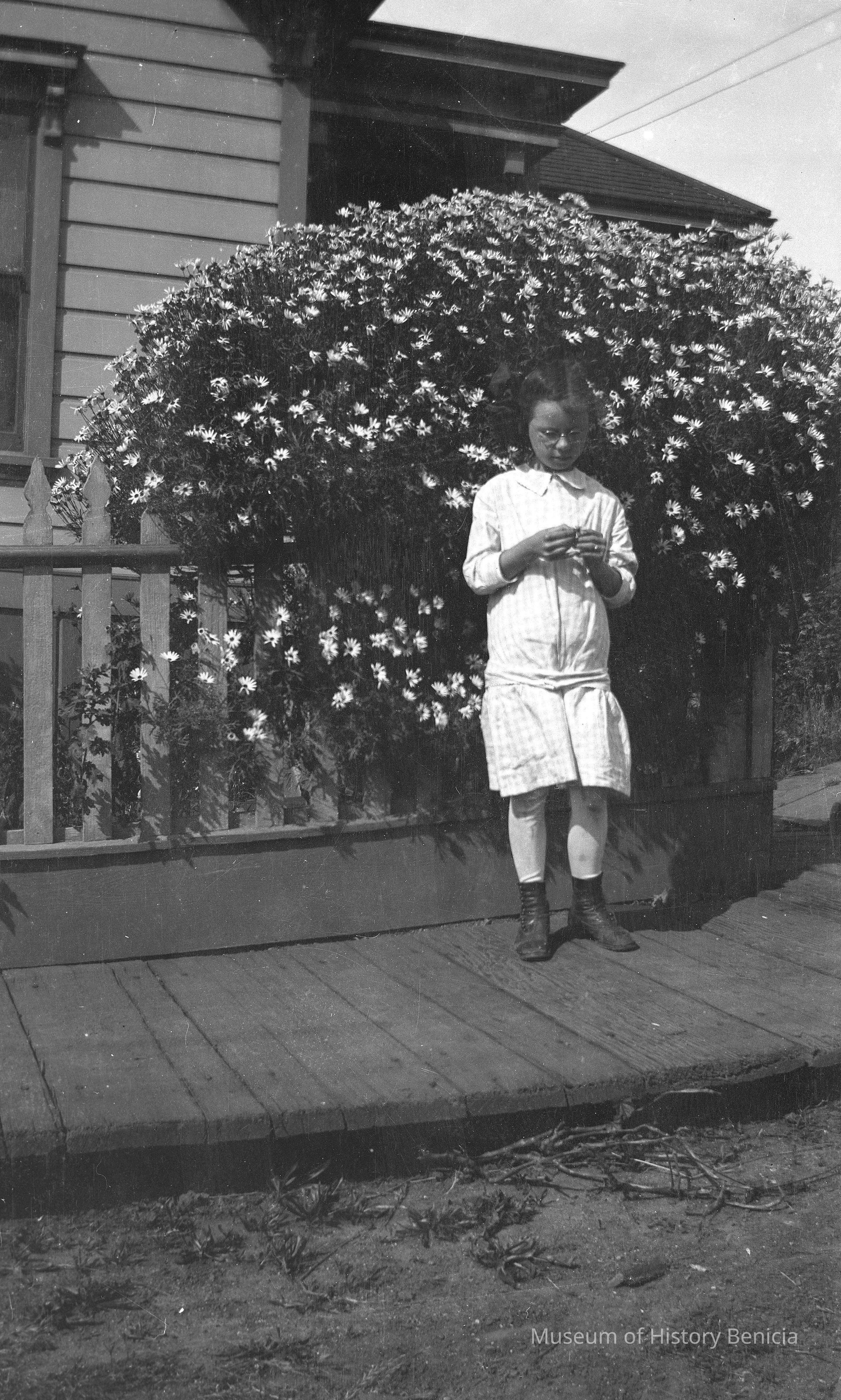 A girl standing on a "boardwalk" side walk with a large plant and a building behind her.