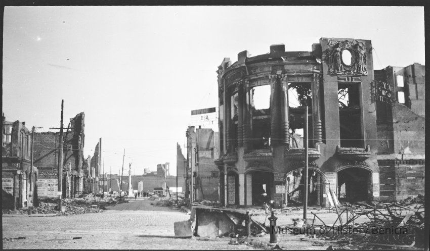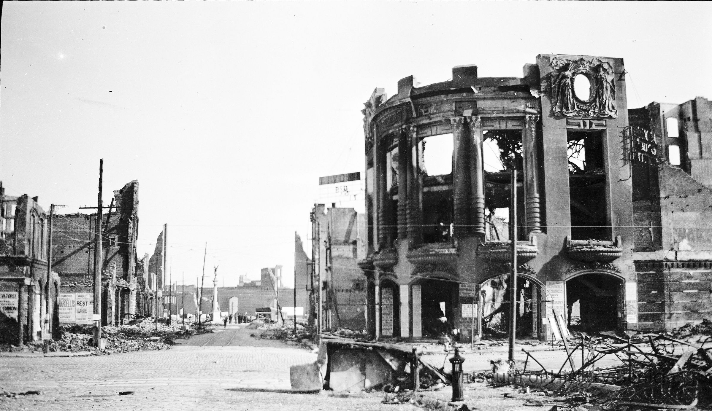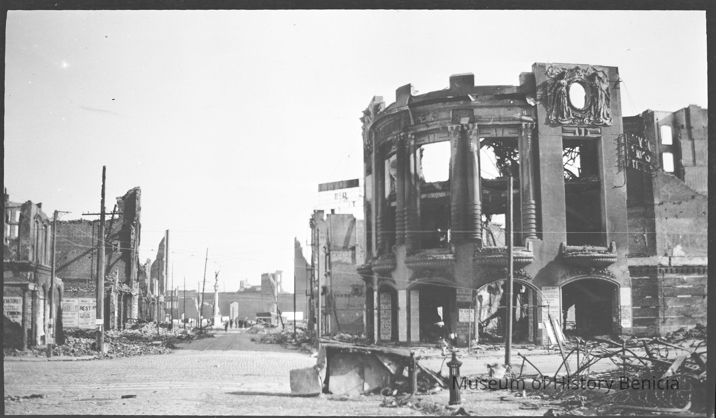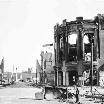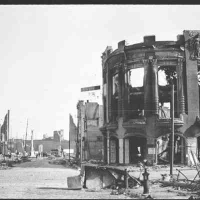 This photo is one of a series of photos of San Francisco after the 1906 earthquake. It shows the start of the city rebuilding. This photo shows the Tivoli Opera House at the corner of Mason and Eddy streets.Collection