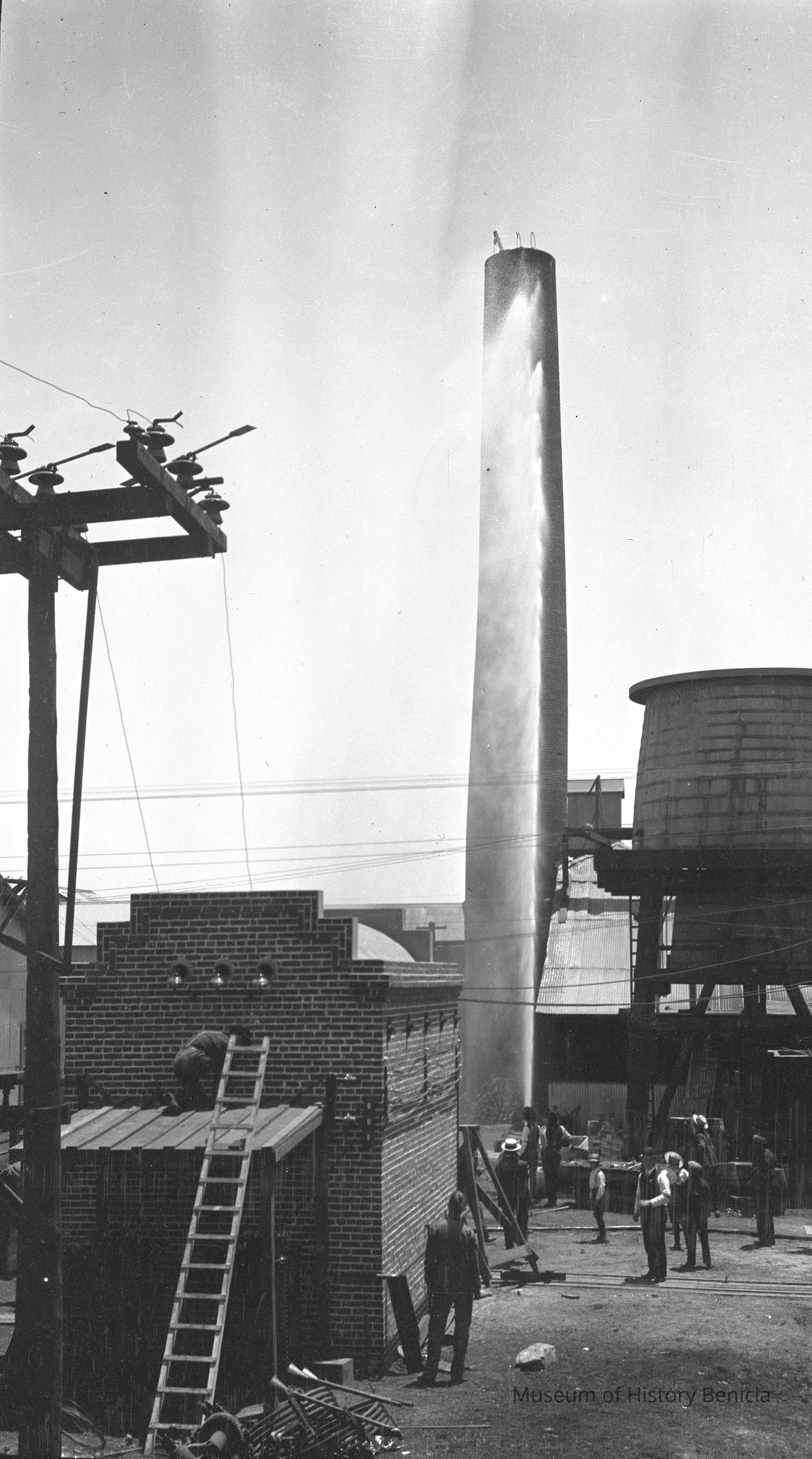 Benicia Fire Department Drill July 1906. Using firehoses at the Benicia Tannery buildings.