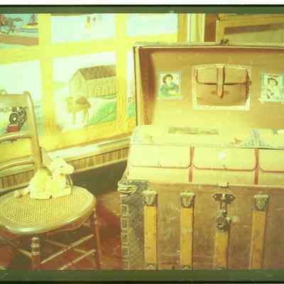 Filmstrip negative of 3 images of a quilt, trunk and a camel.